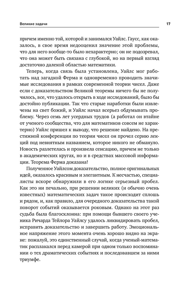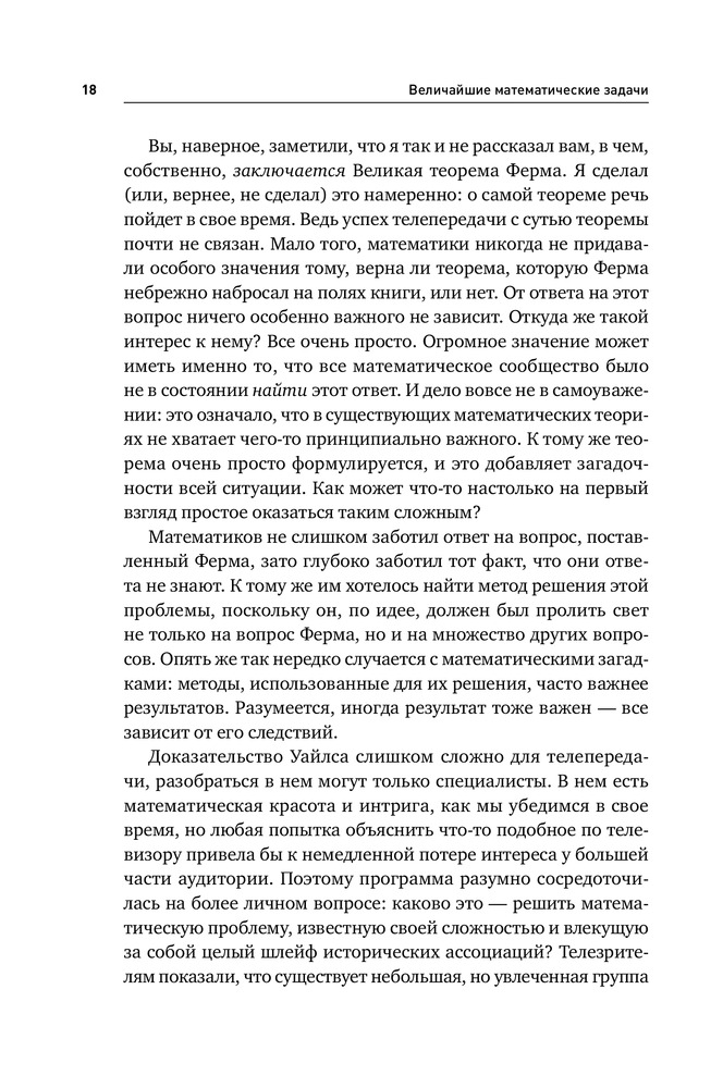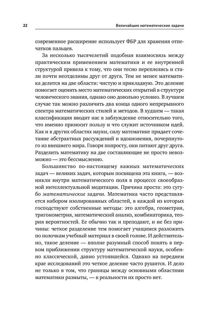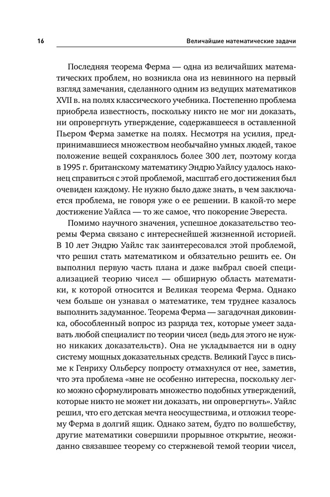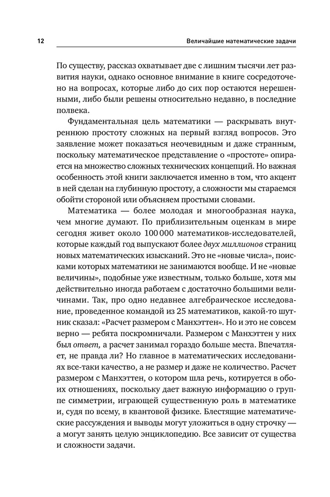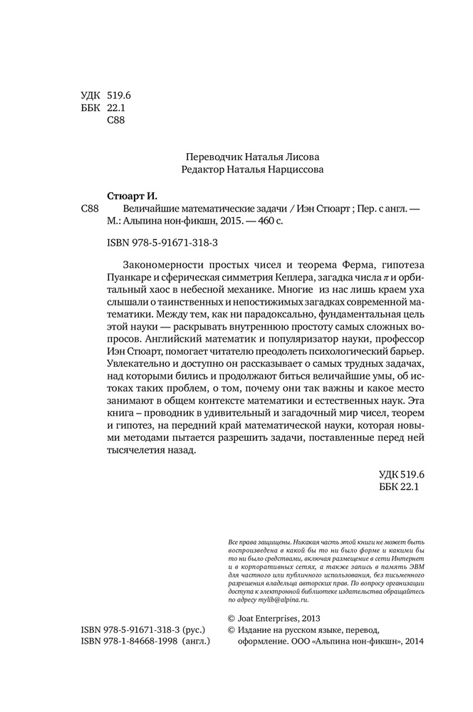 Величайшие математические задачиВ данный момент этот товар отсутствует в продаже. Возможно, у нас найдется аналогичный или похожий товар здесь. Закономерности простых чисел и теорема Ферма, гипотеза Пуанкаре и сферическая симметрия Кеплера, загадка числа П и орбитальный хаос в небесной механике. Многие из нас лишь краем уха слышали о таинственных и непостижимых загадках современной математики. Между тем, как ни парадоксально, фундаментальная цель этой науки — раскрывать внутреннюю простоту самых сложных вопросов. Английский математик и популяризатор науки, профессор Иэн Стюарт, помогает читателю преодолеть психологический барьер. Увлекательно и доступно он рассказывает о самых трудных задачах, над которыми бились и продолжают биться величайшие умы, об истоках таких проблем, о том, почему они так важны и какое место занимают в общем контексте математики и естественных наук. Эта книга - проводник в удивительный и загадочный мир чисел, теорем и гипотез, на передний край математической науки, которая новыми методами пытается разрешить задачи, поставленные перед ней тысячелетия назад. |