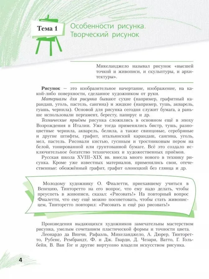Рисунок. Третий год обученияИгорь Иванович Корнеев, Ирина Владимировна Ловцова В данный момент этот товар отсутствует в продаже. Возможно, у нас найдется аналогичный или похожий товар здесь. Учебное пособие предназначено для учащихся детских художественных школ и школ искусств. Подготовлено в соответствии с Федеральными государственными требованиями к дополнительным предпрофессиональным программам. Пособие может быть также полезным для учащихся всех организаций дополнительного образования и общеобразовательных организаций с углублённым изучением предметов образовательной области «Искусство». Пособие для третьего года обучения (соответствует 7 классу общеобразовательной школы) знакомит с художественными материалами и приёмами работы ими, раскрывает особенности линейно-конструктивного и тонального длительного рисунка, рассказывает о последовательности создания тематического натюрморта, натюрморта из гипсовых геометрических тел, рисунка чучела птицы, зарисовок различных предметов с натуры и по памяти. |