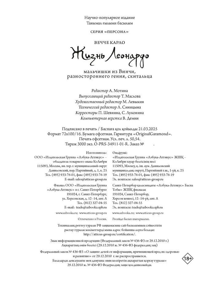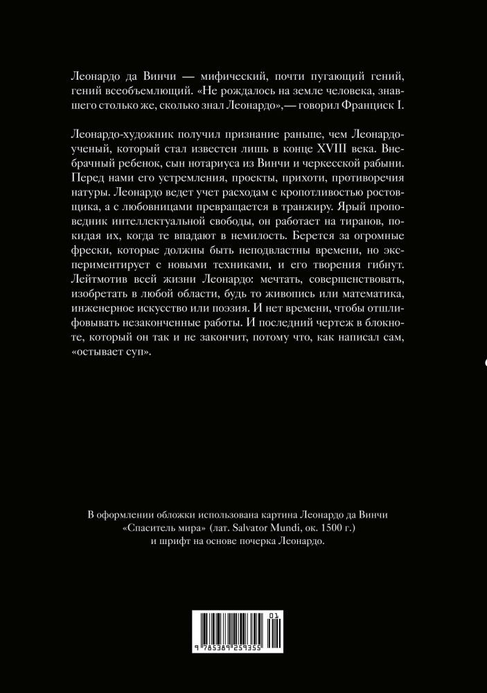 💳 Оплатить за товар можно при получении 🇰🇿 Есть бесплатная доставка по Казахстану от 1 дня 🎁 Копите бонусы с каждой покупки Серия: Персона Леонардо да Винчи ‒ мифический, почти пугающий гений, гений всеобъемлющий. «Не рождалось на земле человека, знавшего столько же, сколько знал Леонардо», — говорил Франциск I. Леонардо-художник получил признание раньше, чем Леонардо-ученый, который стал известен лишь в конце XVIII века. Внебрачный ребенок, сын нотариуса из Винчи и рабыни. Перед нами его устремления, проекты, прихоти, противоречия натуры. Леонардо ведет учет расходам с кропотливостью ростовщика и превращается в транжиру с любовницами. Ярый проповедник интеллектуальной свободы, он работает на тиранов, покидая их, когда те впадают в немилость. Берется за огромные фрески, которые должны быть неподвластны времени, но экспериментирует с новыми техниками, и его творения гибнут. Лейтмотив всей жизни Леонардо: мечтать, совершенствовать, изобретать в любой области, будь то живопись или математика, инженерное искусство или поэзия. И нет времени, чтобы отшлифовывать незаконченные работы. И последний чертеж в блокноте, который он так и не закончит, потому что, как написал сам, «остывает суп». |