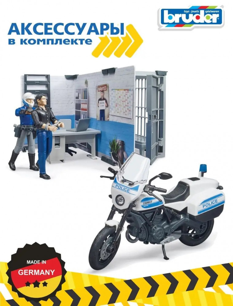 💳 Оплатить за товар можно при получении 🇰🇿 Есть бесплатная доставка по Казахстану от 1 дня 🎁 Копите бонусы с каждой покупки Большой игровой набор Bruder реалистично имитирует полицейский участок (размер — 18.5×22.5 см). В набор входит мотоцикл Scrambler Ducati с поворачивающими рулём, пружинистой подвеской и резиновыми шинами. Фигурка полицейского оснащена наручниками, рацией, фонариком, перчатками и шлемом. На дополнительную фигурку заключённого можно одеть или положить в руки любые аксессуары в наборе. Сам полицейский участок состоит из стандартных блоков которые совместимы с другими наборами Bruder, а также уникальных блоков имитирующих камеру с открывающейся дверью. Большой игровой набор Bruder — отличный подарок к любому празднику для детей от 4 лет. Все игрушки Bruder изготовлены в Германии, имеют европейские и российские сертификаты, что является гарантом качества. |
