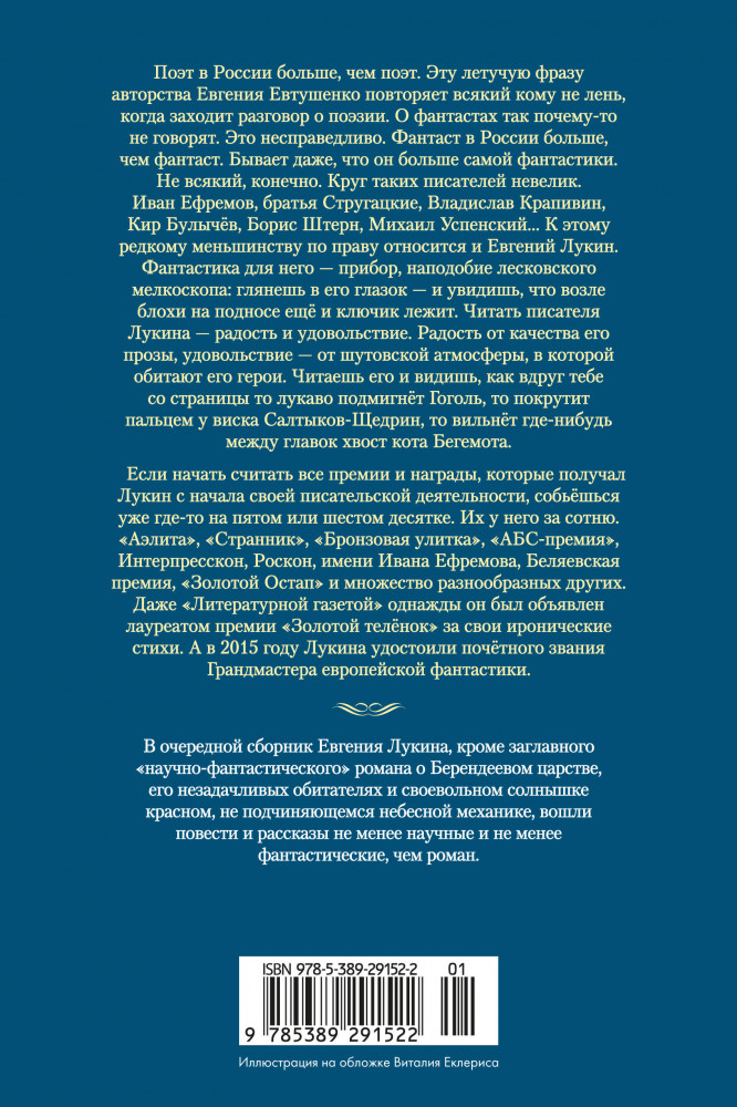 💳 Оплатить за товар можно при получении 🇰🇿 Есть бесплатная доставка по Казахстану 🎁 Копите бонусы с каждой покупки Серия: Фантастика и фэнтези. Большие книги Поэт в России больше, чем поэт. Эту летучую фразу авторства Евгения Евтушенко повторяет всякий, кому не лень, когда заходит разговор о поэзии. О фантастах так почему-то не говорят. Это несправедливо. Фантаст в России больше, чем фантаст. Бывает даже, что он больше самой фантастики. Не всякий, конечно. Круг таких писателей невелик. Иван Ефремов, братья Стругацкие, Владислав Крапивин, Кир Булычёв, Борис Штерн, Михаил Успенский... К этому редкому меньшинству по праву относится и Евгений Лукин. Фантастика для него — прибор наподобие лесковского мелкоскопа: глянешь в его глазок и увидишь, что возле блохи на подносе ещё и ключик лежит. Читать писателя Лукина — радость и удовольствие. Радость от качества его прозы, удовольствие — от шутовской атмосферы, в которой обитают его герои. Читаешь его и видишь, как вдруг тебе со страницы то лукаво подмигнёт Гоголь, то покрутит пальцем у виска Салтыков-Щедрин, то вильнёт где-нибудь между главок хвост кота Бегемота. |