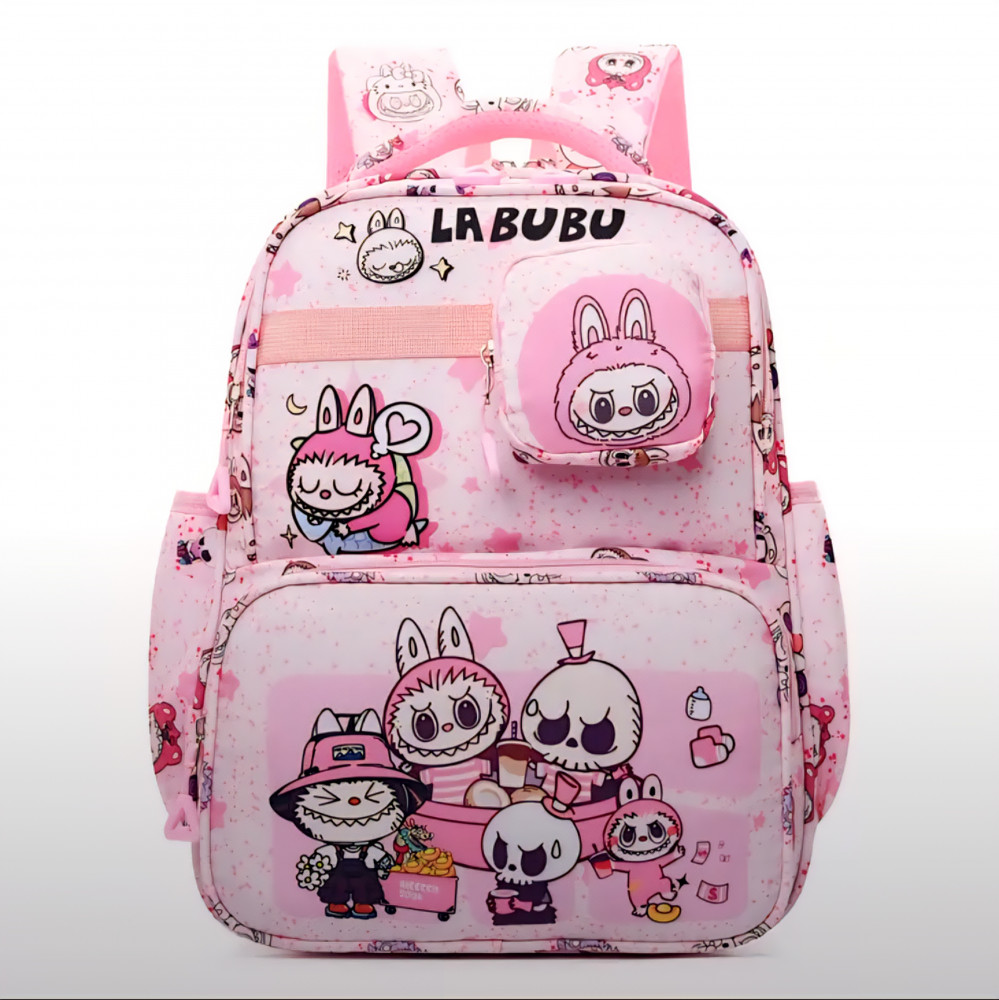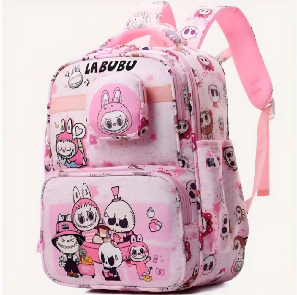 Стильный и удобный рюкзак для девочек идеально подойдет для школы, прогулок или поездок. С ним можно ходить на тренировки и любой другой кружок или секцию, для сменки. Рюкзак для 1-5 класса выполнен из прочного материала с водоотталкивающими свойствами, что обеспечивает надежную защиту содержимого. Поверхность украшена яркими принтами с милыми Лабубу, который так нравится детям. На передней части большой объемный карман и кошелек, закрепленный на липучку, который можно отстегнуть и применять отдельно.