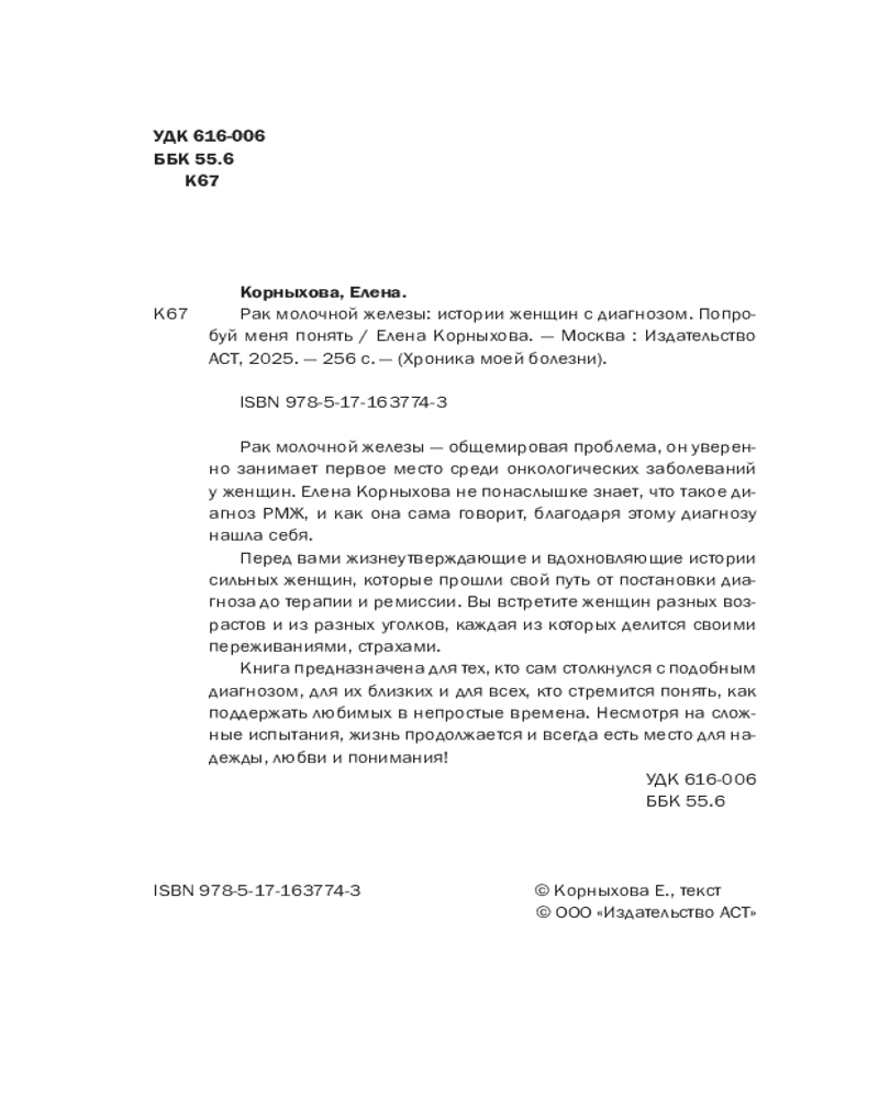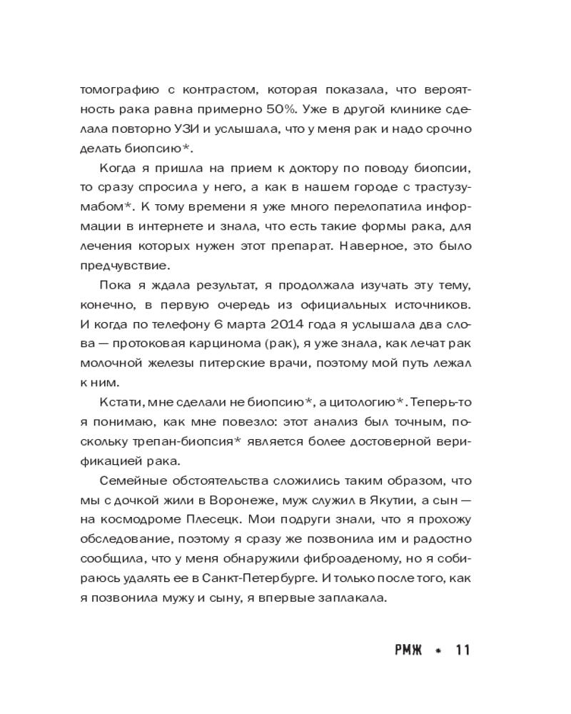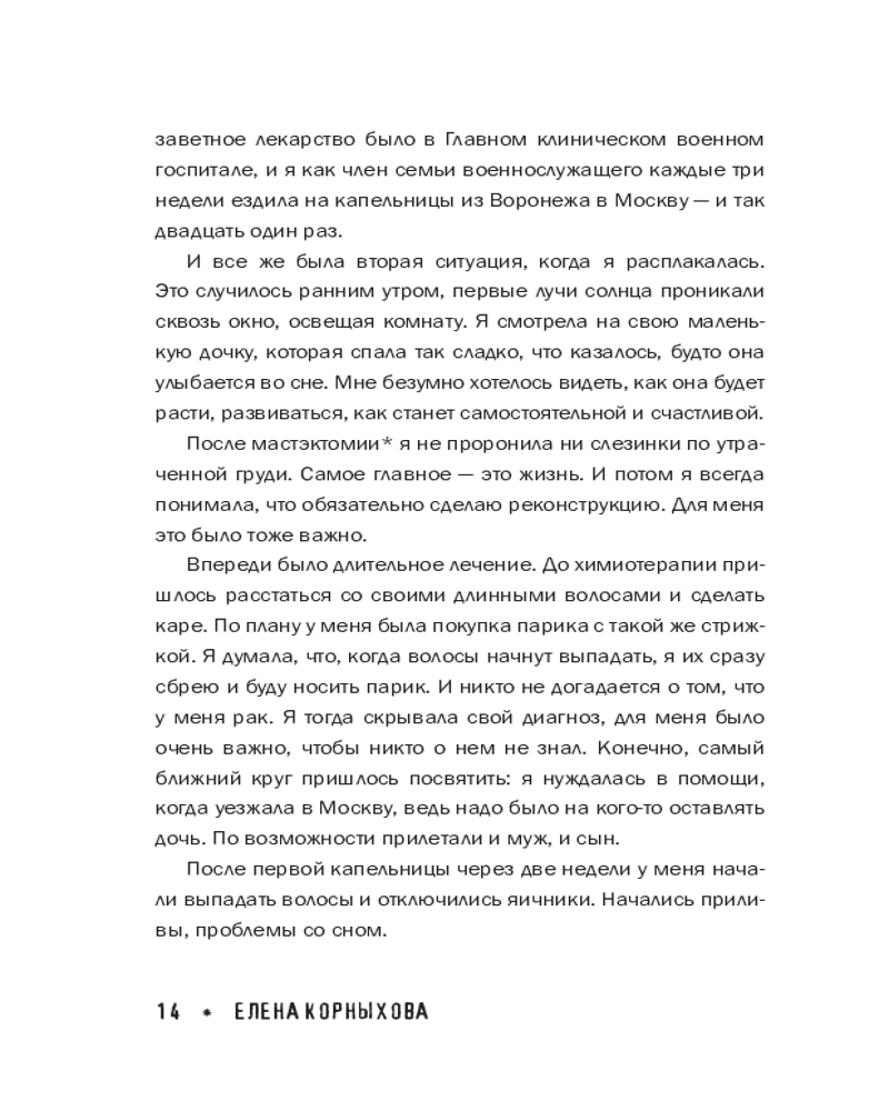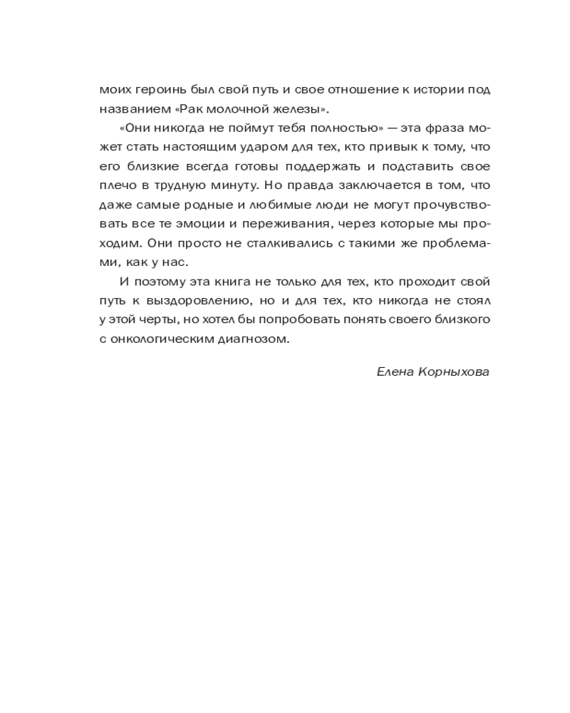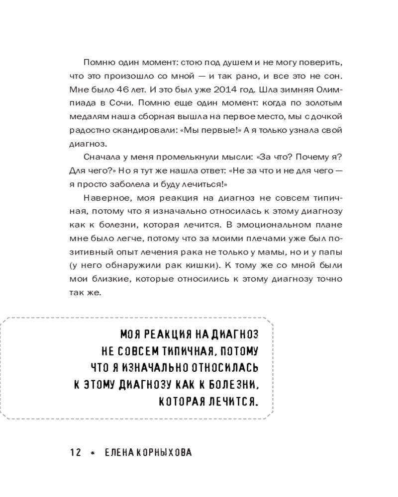 Серия: Хроника моей болезни Елена Корныхова — член правления и координатор Северо-Западного федерального округа, Председатель регионального отделения Всероссийской общественной организации помощи пациентам «Ассоциация онкологических пациентов «Здравствуй!», автор проекта «Медицинский репортер». Диагностирован РМЖ в 2014 году. В ремиссии более 10 лет! |