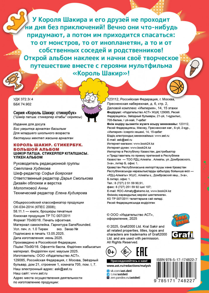 Серия: Король Шакир: стикербук У Короля Шакира и его друзей не проходит ни дня без приключений! Вечно они что-нибудь придумают, а потом им приходится спасаться: то от монстров, то от инопланетян, а то и от собственных соседей и родственников! Открой альбом наклеек и начни своё творческое путешествие вместе с героями мультфильма «Король Шакир»! |