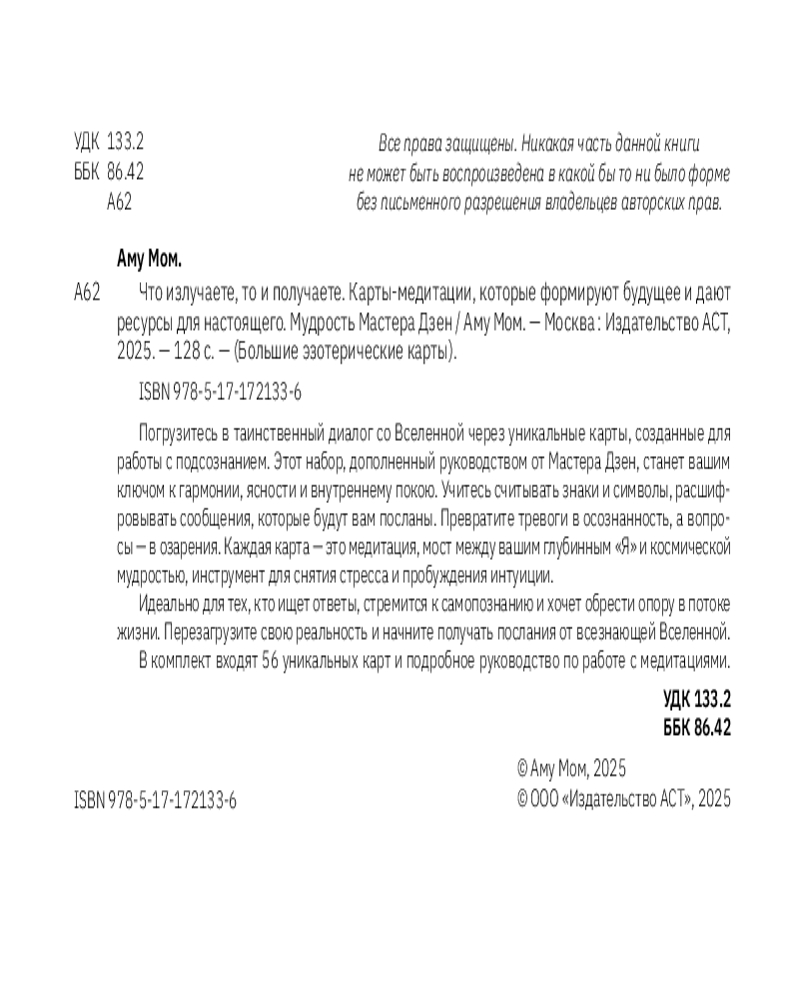💳 Оплатить за товар можно при получении 🇰🇿 Есть бесплатная доставка по Казахстану от 1 дня 🎁 Копите бонусы с каждой покупки Серия: Большие эзотерические карты (коробка с картами + руководство) Погрузитесь в таинственный диалог со Вселенной через уникальные карты, созданные для работы с подсознанием. Этот набор, дополненный руководством от Мастера Дзен, станет вашим ключом к гармонии, ясности и внутреннему покою. Учитесь считывать знаки и символы, расшифровывать сообщения, которые будут вам посланы. Превратите тревоги в осознанность, а вопросы — в озарения. Каждая карта — это медитация, мост между вашим глубинным «Я» и космической мудростью, инструмент для снятия стресса и пробуждения интуиции. |