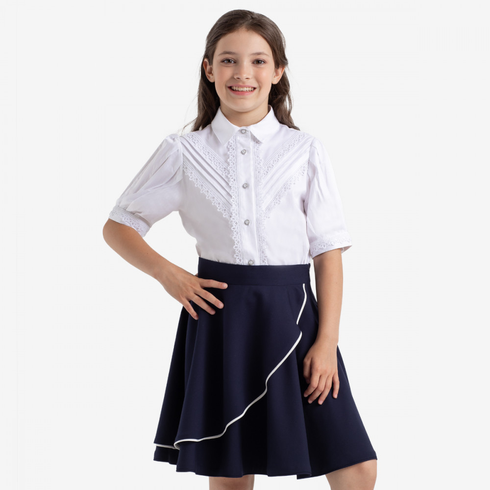 Классическая школьная юбка темно синего цвета выполнена из поливискозы. Поливискоза приятна к телу, ткань не скатывается, мало мнется, легка в уходе, сохраняет форму и цвет после многих стирок. Школьная юбка-солнце дополнена вторым слоем с контрастной отделкой. Школьная юбка имеет утяжку по талии за счет, вставленной внутрь резинки с перфорационными отверстиями.