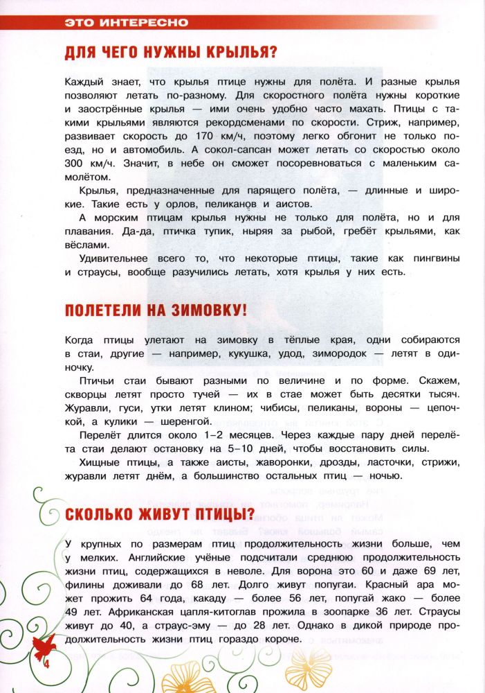 Например, помогают ли крылья плавать? Может ли птица обогнать самолёт? У кого самый большой клюв? Бывает ли гнездо размером со стог сена? Можно ли с птицей ходить на рыбалку? Зачем пудрится цапля? Бывают ли на крыльях когти? Какие птицы могут быть охранниками? Зачем голубям нужны "чёрные очки"? Для чего шахтёру канарейка?