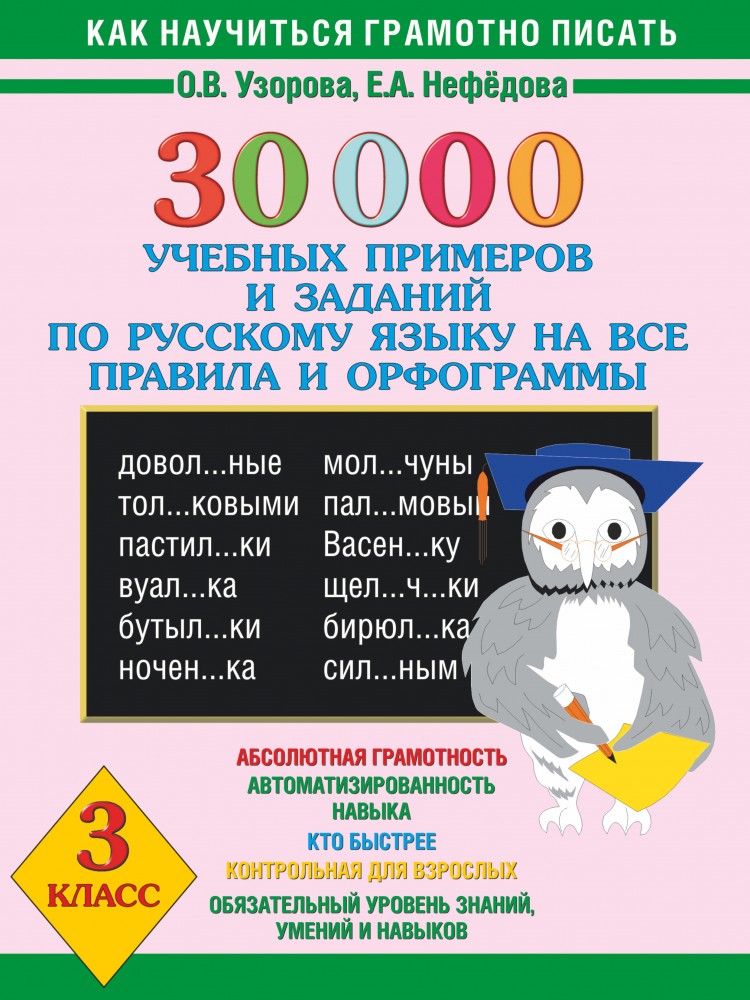 30000 учебных примеров и заданий по русскому языку на все правила и орфограммы. 3 классОльга Васильевна Узорова, Елена Алексеевна Нефедова В данный момент этот товар отсутствует в продаже. Возможно, у нас найдется аналогичный или похожий товар здесь. Серия: Как научиться грамотно писать Издание содержит 30 000 примеров и заданий на закрепление основных правил, предусмотренных программой по русскому языку для 3 класса. Весь материал пособия систематизирован по орфограммам. Для удобства использования в начале каждого раздела даются теоретические сведения. Это позволяет учащимся повторить правило и сразу же закрепить, выполнив ряд практических заданий. Путем регулярных упражнений школьники усвоят навыки грамотного письма и орфографические правила. |