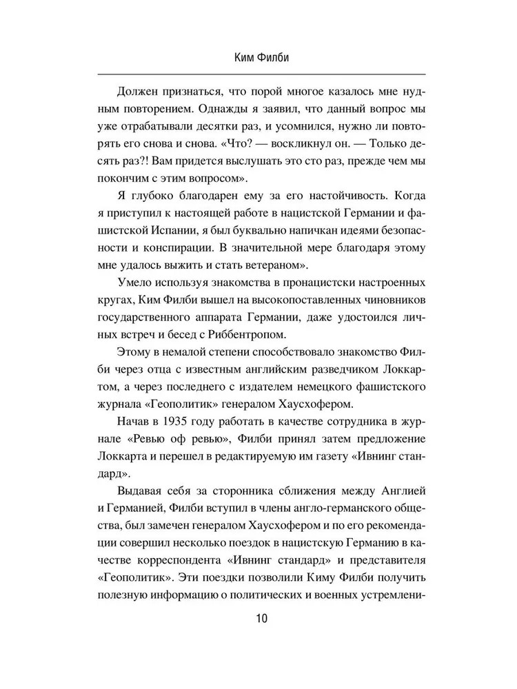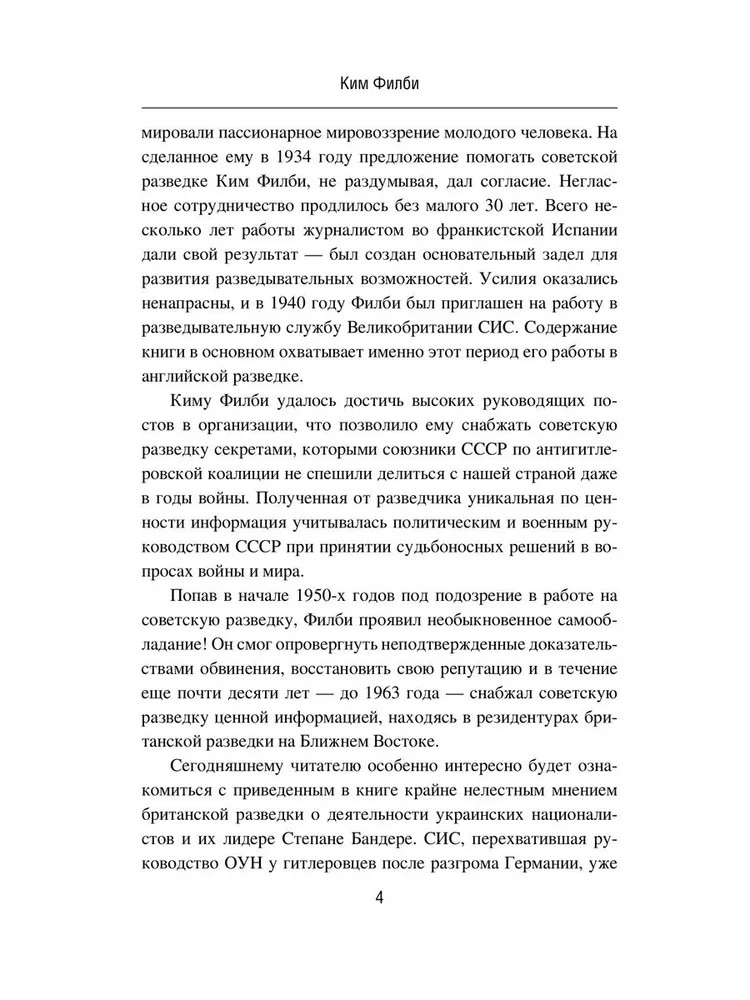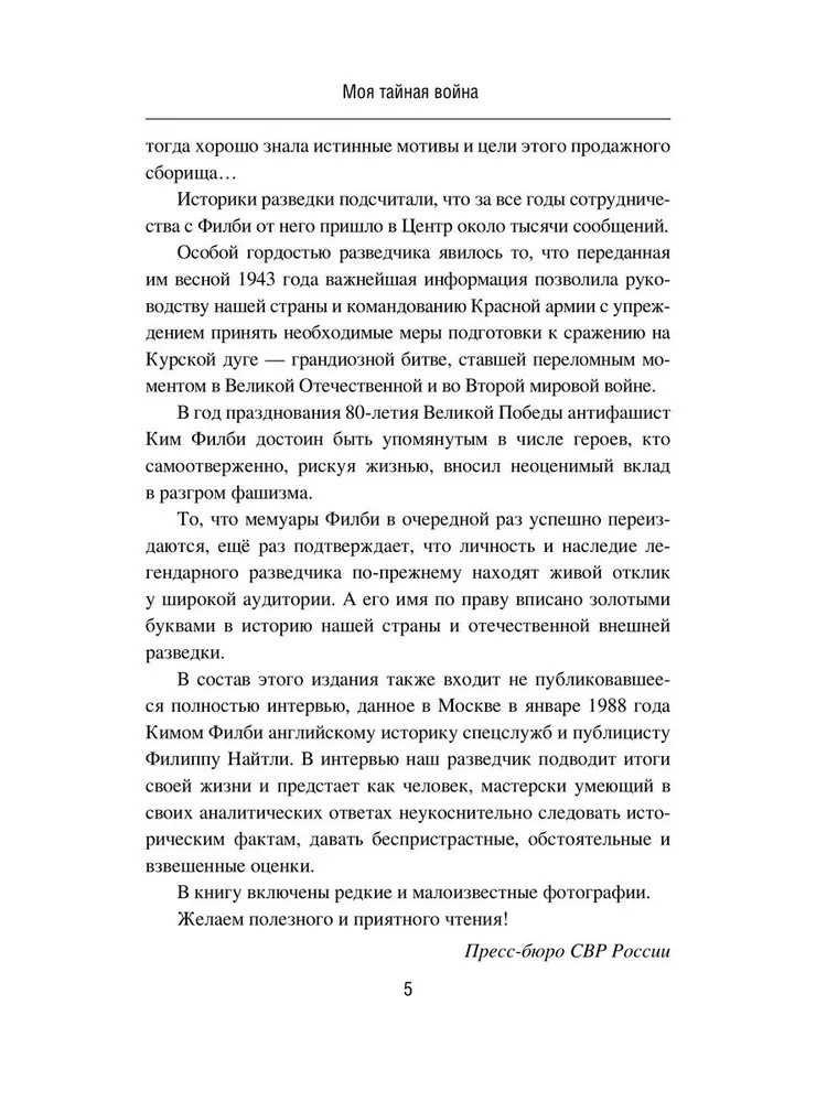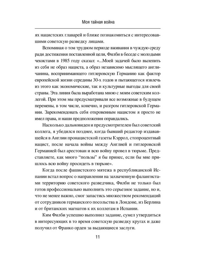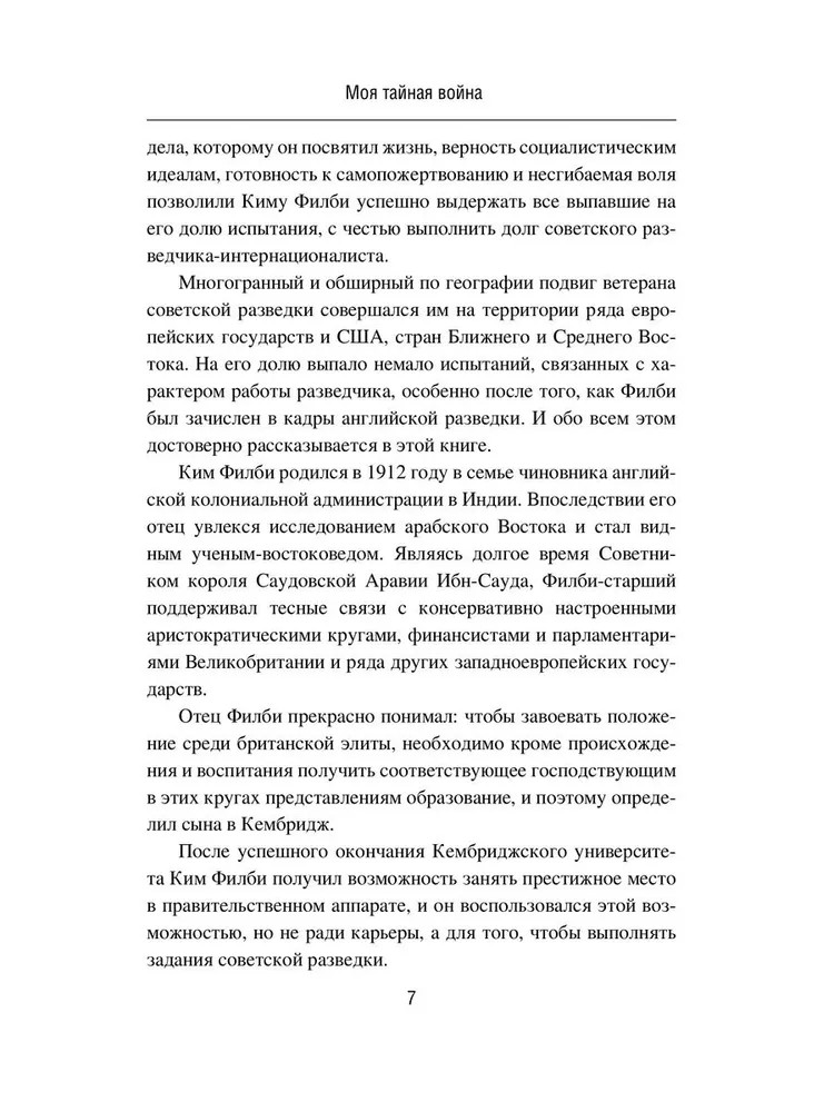 Моя тайная война. Воспоминания советского разведчикаВ данный момент этот товар отсутствует в продаже. Возможно, у нас найдется аналогичный или похожий товар здесь. Воспоминания Кима Филби — яркий, волнующий рассказ советского разведчика, более пятидесяти лет посвятившего разведывательной работе, о своем жизненном пути, о тех сложных и ответственных заданиях, которые ему довелось выполнять. В книге приводится полный текст интервью Кима Филби, данного английскому писателю и публицисту Филиппу Найтли в Москве в январе 1988 года, а также две статьи о разведчике этого автора. В этом издании, рассчитанном на широкий круг читателей, помещены фотографии из личного архива автора. |