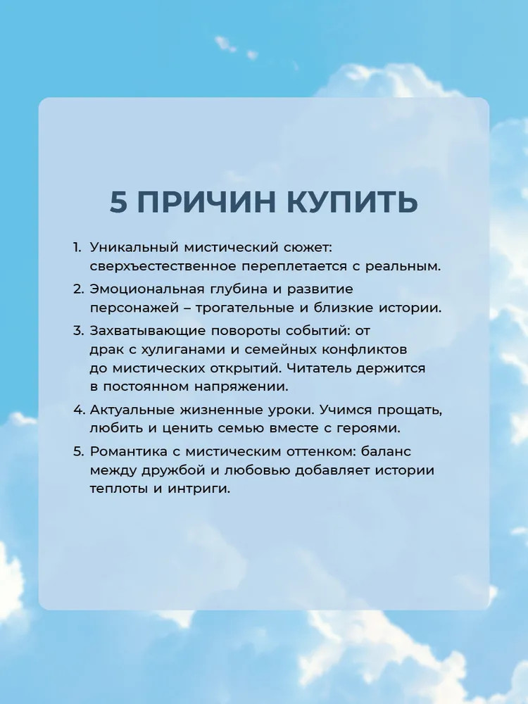 💳 Оплатить за товар можно при получении 🇰🇿 Есть бесплатная доставка по Казахстану от 1 дня 🎁 Копите бонусы с каждой покупки После смерти Мира совсем не помнит своего прошлого. По словам архангела Гавриила, она стала ангелом-хранителем за то, что спасла жизнь другого человека ценой своей собственной. Но ее первый подопечный Никита Ларионов невыносим. И к тому же он единственный, кто видит ангела. И только он может помочь Мире узнать о ее прошлом. Но поможет ли она ему взамен вылечить разбитое сердце и обрести надежду на счастливое будущее? Роман о чувствах с элементами мистики, уникальным настроением переплетения сверхъестественного и реального. |