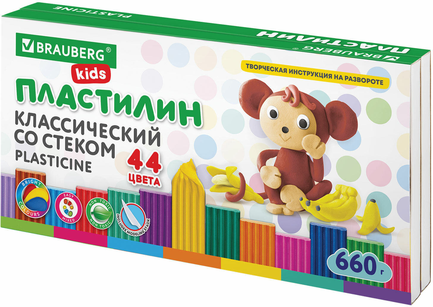 Пластилин обладает высоким качеством, прекрасными пластичными свойствами, легко принимает нужную форму. Не токсичен, безопасен для детей. Яркие и насыщенные цвета вызовут у детей исключительно положительные эмоции. Большой набор из 44 цветов поможет ребенку создать поистине уникальную поделку, миниатюрную скульптуру или картину.
