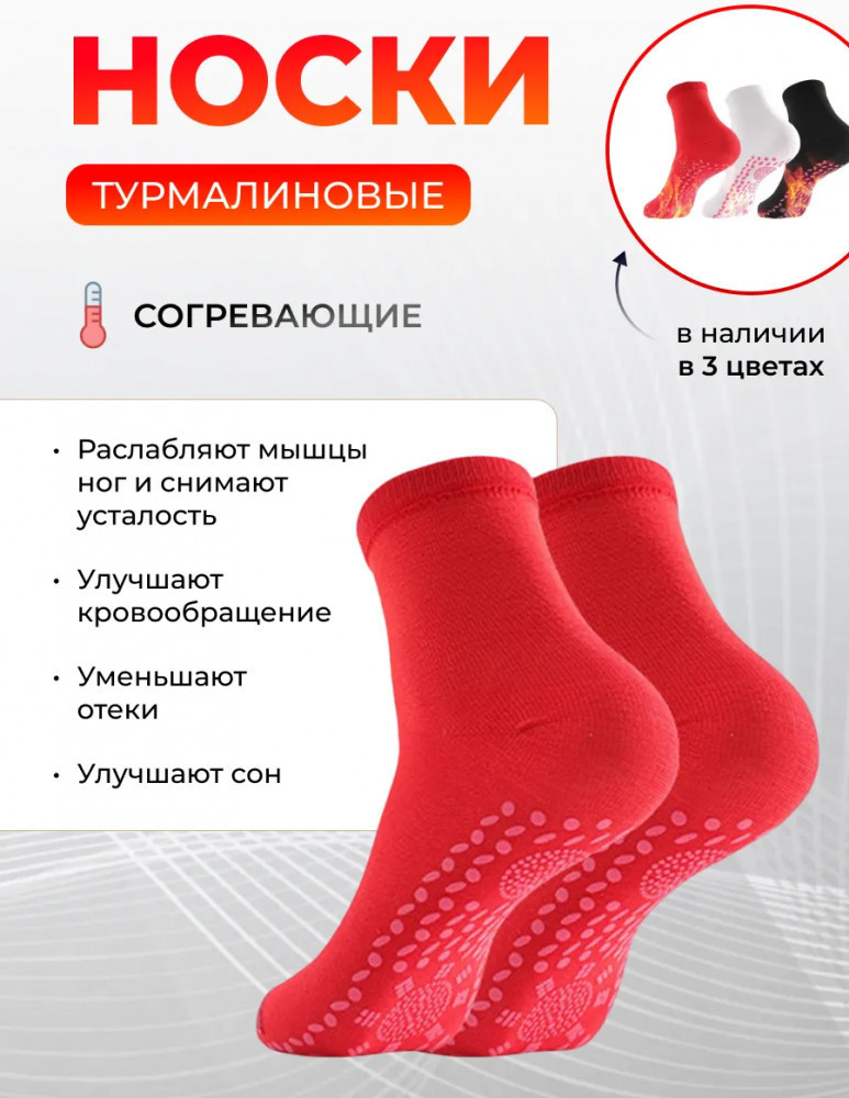 Турмалиновые носки — замечательное применение уникальной ткани с включением микрокристаллов турмалина, которые обладают отличными профилактическими и лечебными свойствами. Изготовлены из ткани, созданной по технологии «жидкого турмалина» с вплетенными в нити микрокристаллами турмалина. Основной принцип воздействия такой полезной разработки ученых основан на инфракрасном излучении микрочастиц вещества турмалин, которое активизируется при повышении температуры от тепла тела. Таким образом, отрицательно заряженные ионы проникают глубоко под кожу, в мышечную ткань, борются с вредными веществами, накопленными организмом, в том числе и с опасными активными радикалами.
