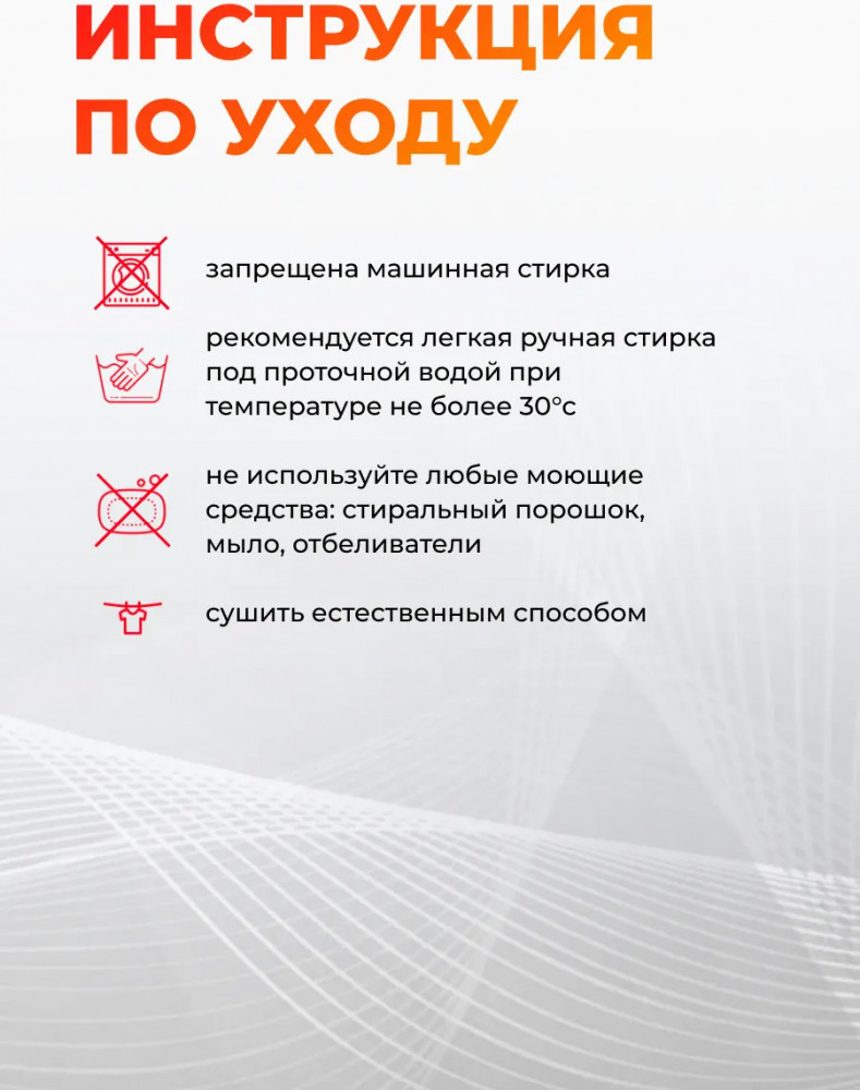 Уход: не рекомендуется стирать изделие с использованием порошков, отбеливателей и т. д. Нельзя стирать изделия в стиральной машине, а также замачивать в воде. Это вызовет потерю функциональных свойств изделия. Рекомендуется ручная стирка в воде при t- не более 30-40-C, время стирки не должно превышать 5 минут. Допускается использование турмалинового мыла. Споласкивать в слабосоленой воде. Бережный уход не окажет влияния на эффективность действия турмалиновых изделий, и они долго прослужат на благо вашего здоровья.