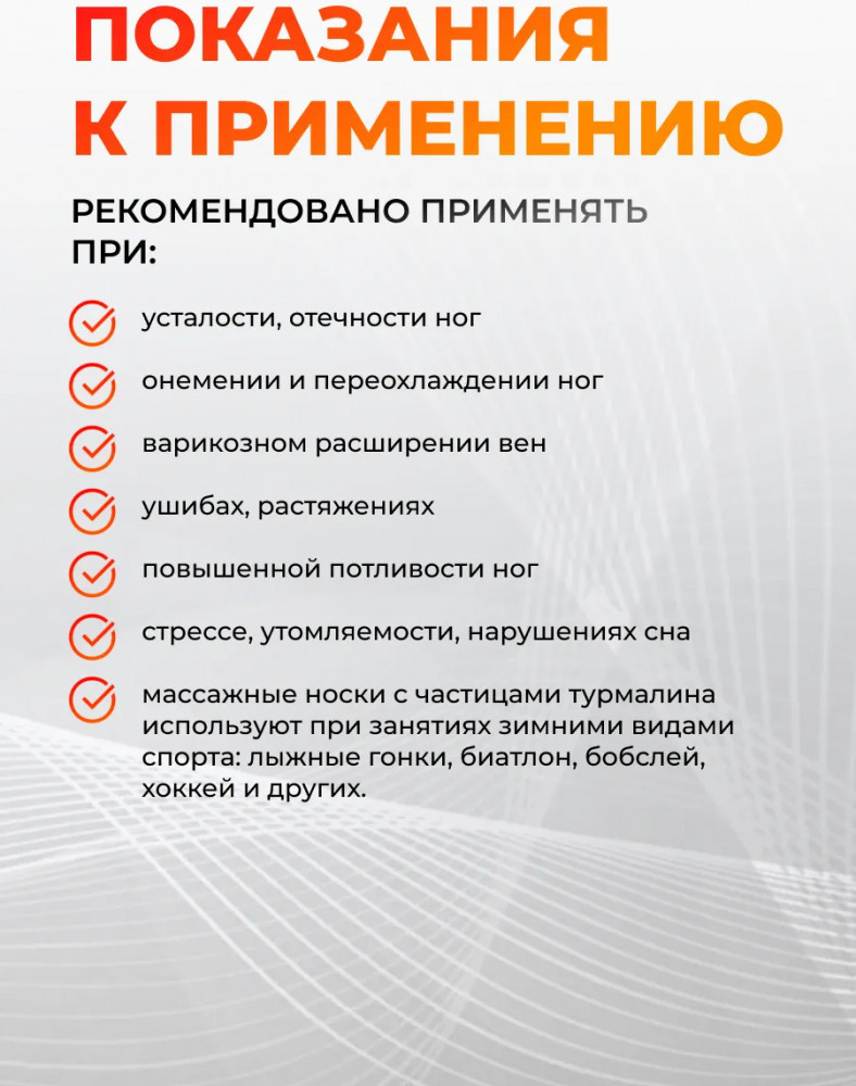 Способ применения: использование в любое время дня, каждый день, можно даже ночью во время сна. Для того, чтобы ощутить полезный эффект максимально быстро, следует регулярно надевать носочки на ночь, по началу на 15-20 минут, потом уже увеличивая время до 8-10 часов. Учитывая индивидуальное состояние организма, регулируйте продолжительность ношения турмалиновых носков. Такие носки могут использовать при переездах и длительных перелетах, они обеспечат отсутствие усталости и отечности. При этом ориентируйтесь на индивидуальную переносимость.