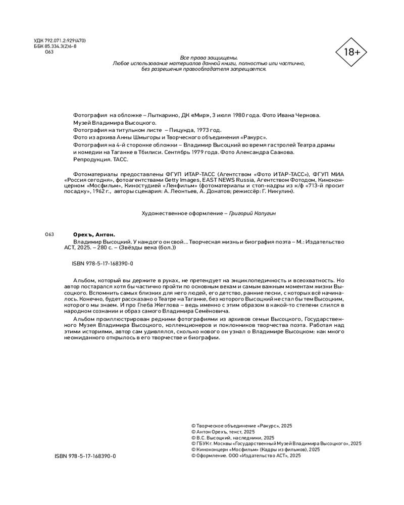 💳 Оплатить за товар можно при получении 🇰🇿 Есть бесплатная доставка по Казахстану от 1 дня 🎁 Копите бонусы с каждой покупки Серия: Звезды века (бол.) Альбом, который вы держите в руках, не претендует на энциклопедичность и всеохватность. Но автор постарался хотя бы частично пройти по основным вехам и самым важным моментам жизни Высоцкого. Вспомнить самых близких для него людей, его детство, ранние песни, с которых всё начиналось. Конечно, будет рассказано о Театре на Таганке, без которого Высоцкий не стал бы тем Высоцким, которого мы знаем. И про Глеба Жеглова — ведь именно с этим образом в какой-то степени слился в народном сознании и образ самого Владимира Семёновича. |