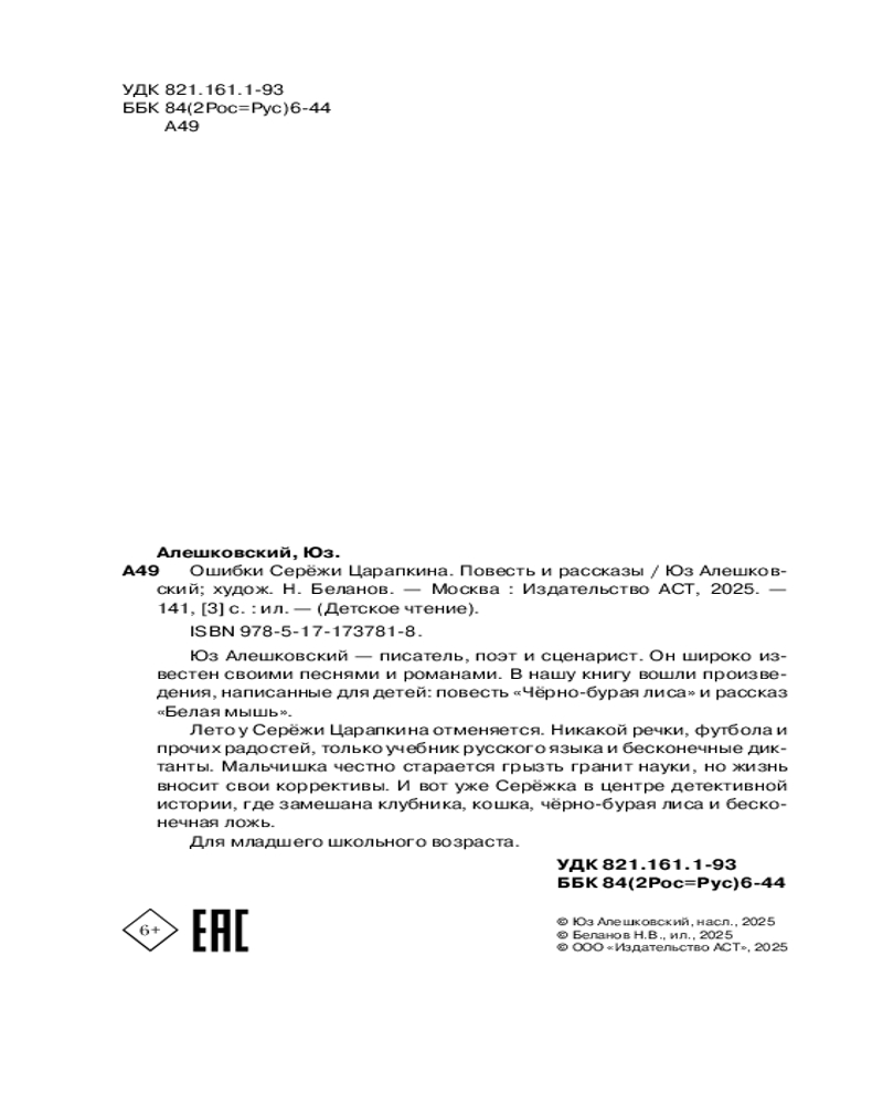 💳 Оплатить за товар можно при получении 🇰🇿 Есть бесплатная доставка по Казахстану от 1 дня 🎁 Копите бонусы с каждой покупки Серия: Детское чтение Юз Алешковский — писатель, поэт и сценарист. Он широко известен своими песнями и романами. В нашу книгу вошли произведения, написанные для детей: повесть «Чёрно-бурая лиса» и рассказ «Белая мышь». Лето у Серёжи Царапкина отменяется. Никакой речки, футбола и прочих радостей, только учебник русского языка и бесконечные диктанты. Мальчишка честно старается грызть гранит науки, но жизнь вносит свои коррективы. И вот уже Серёжа в центре детективной истории, где замешана клубника, кошка, чёрно-бурая лиса и бесконечная ложь. Для младшего школьного возраста. |