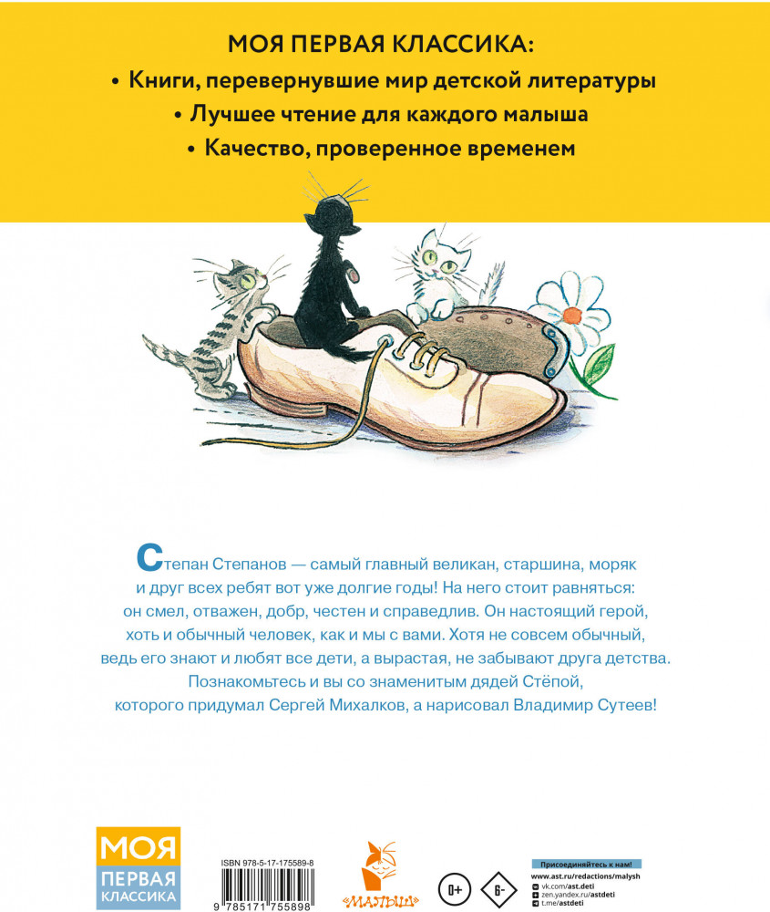 💳 Оплатить за товар можно при получении 🇰🇿 Есть бесплатная доставка по Казахстану от 1 дня 🎁 Копите бонусы с каждой покупки Серия: Моя первая классика В книгу вошли две части знаменитой поэмы Сергея Михалкова о дяде Стёпе: «Дядя Стёпа» и «Дядя Стёпа — милиционер» с рисунками Владимира Сутеева. Владимир Сутеев — художник, мультипликатор, режиссёр многих любимых мультфильмов нашей страны, в том числе и мультфильма «Дядя Стёпа» 1939 года. Вторую часть поэмы, «Дядя Стёпа — милиционер», Владимир Сутеев проиллюстрировал в 1950-х годах. Эта книга — библиографическая редкость: в одной книге собраны две части поэмы Сергея Михалкова в рисунках В. Сутеева. |
