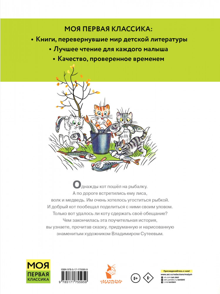 💳 Оплатить за товар можно при получении 🇰🇿 Есть бесплатная доставка по Казахстану от 1 дня 🎁 Копите бонусы с каждой покупки Серия: Моя первая классика «Кот-рыболов» — поучительная сказка, придуманная и проиллюстрированная знаменитым художником и сценаристом Владимиром Григорьевичем Сутеевым. Благодаря сказке малыши узнают, стоит ли делить то, чего пока нет, и почему так важно терпение. |
