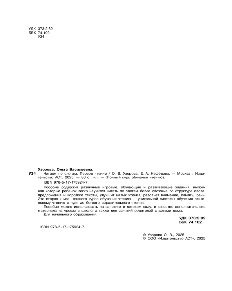 💳 Оплатить за товар можно при получении 🇰🇿 Есть бесплатная доставка по Казахстану от 1 дня 🎁 Копите бонусы с каждой покупки Серия: Полный курс обучения чтению Пособие «Первая книга чтения по слогам» содержит различные игровые, обучающие и развивающие задания, выполняя которые ребёнок легко научится читать по слогам более сложные по структуре слова, предложения и короткие тексты, улучшит навык чтения, разовьёт внимание, память, речь. Это вторая книга полного курса обучения чтению — уникальной системы обучения смысловому чтению с нуля до беглого выразительного чтения. |