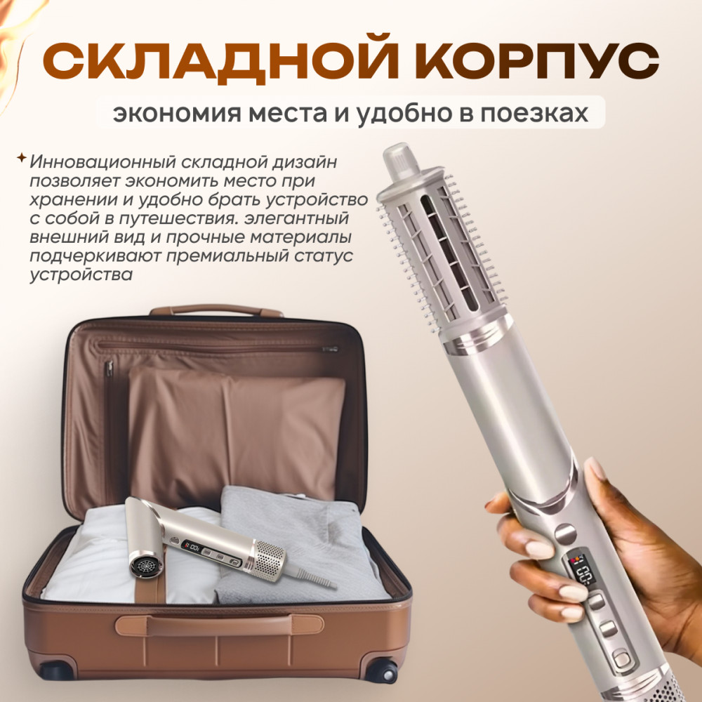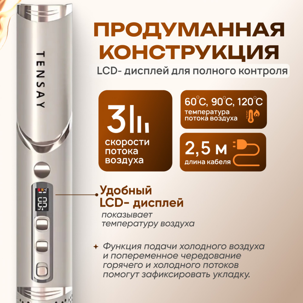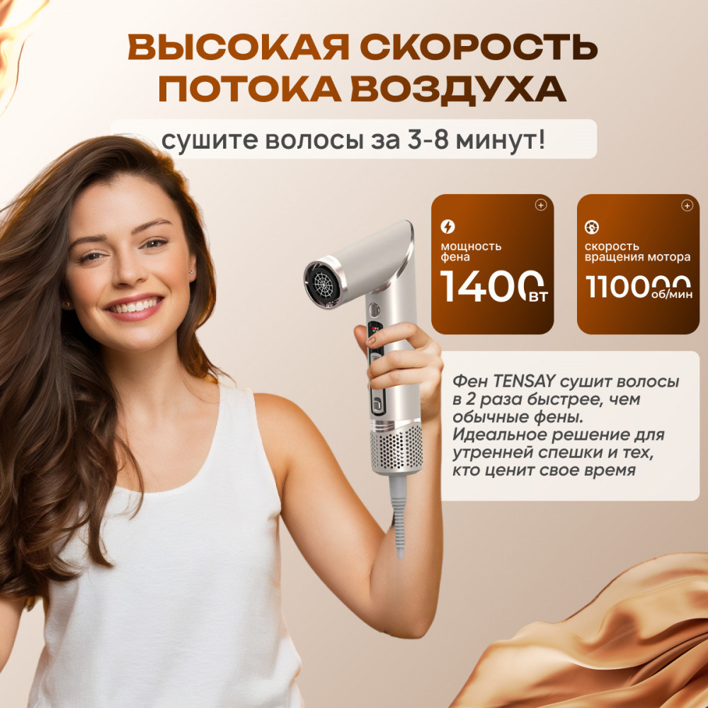 В данный момент этот товар отсутствует в продаже. Возможно, у нас найдется аналогичный или похожий товар здесь. Откройте мир профессионального ухода за волосами прямо у себя дома! Многофункциональный стайлер TENSAY 8 в 1 сочетает в себе фен, плойку, брашинг и диффузор. Высокоскоростной бесщеточный DC мотор (110000 об/мин) и мощность 1400 Вт обеспечивают быстрое высушивание и укладку без перегрева волос. Технология отрицательных ионов (200 млн) делает волосы гладкими и блестящими, предотвращая появление статического электричества.