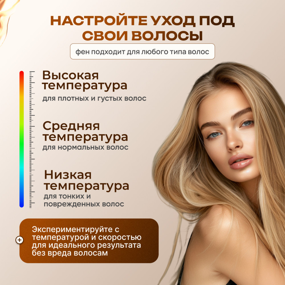 Фен подходит для любого типа волос: низкая температура оптимальна для тонких и поврежденных волос, средняя — для нормальных, а высокая — для плотных и густых. Вы можете экспериментировать с температурным режимом и скоростью подачи воздуха, чтобы добиться идеального результата без вреда для структуры волос. Инновационный складной дизайн делает устройство удобным для хранения и идеальным спутником в путешествиях. Элегантный внешний вид, высокое качество сборки и прочные материалы подчеркивают премиальный статус фена, делая его не только функциональным, но и стильным аксессуаром. |