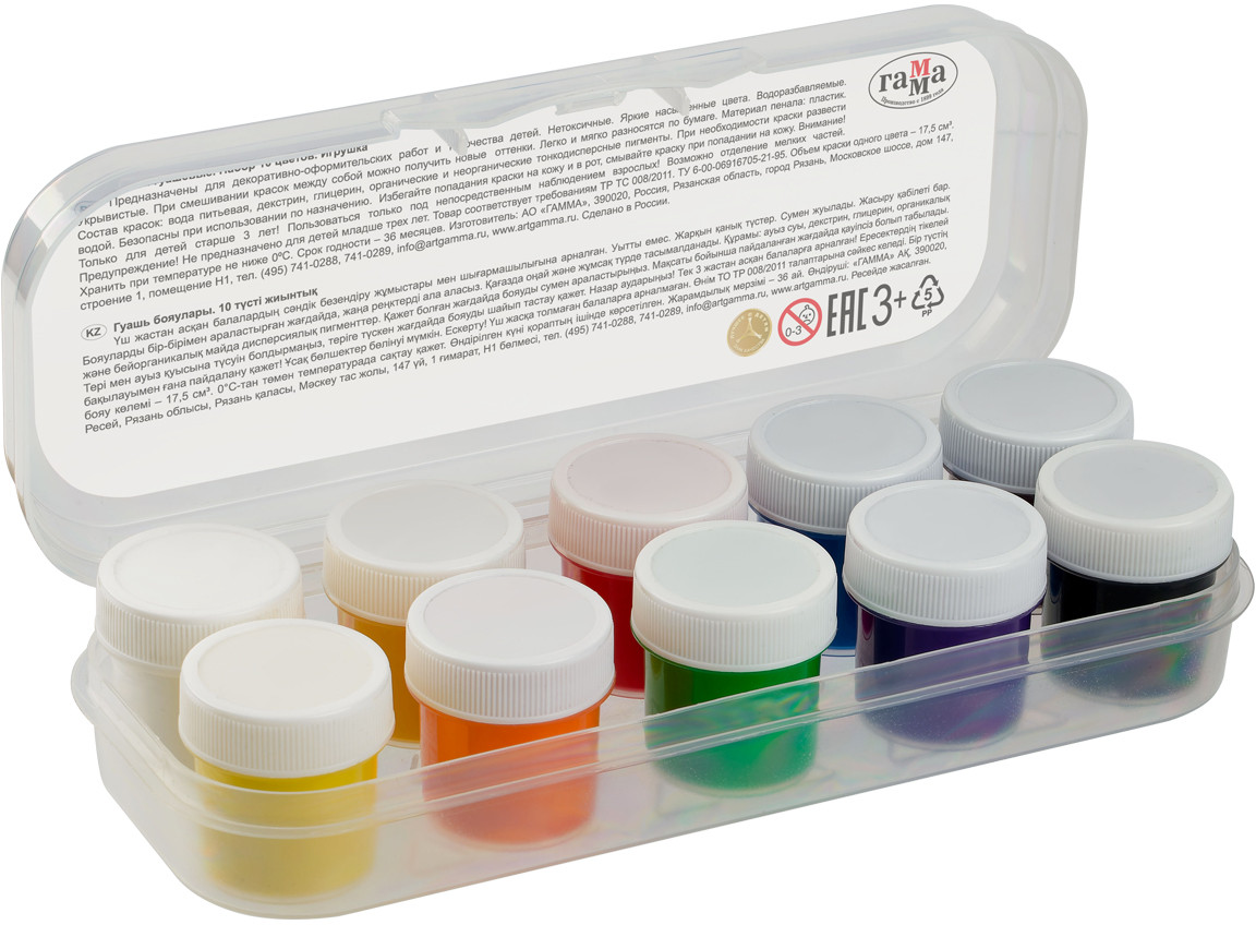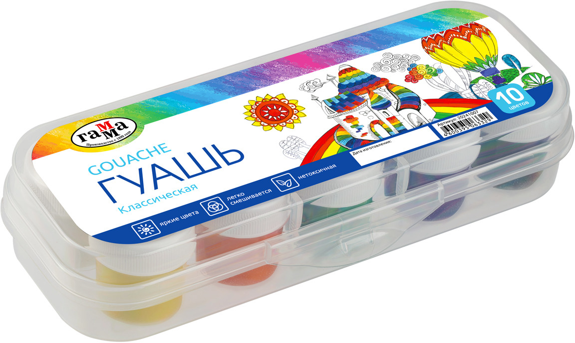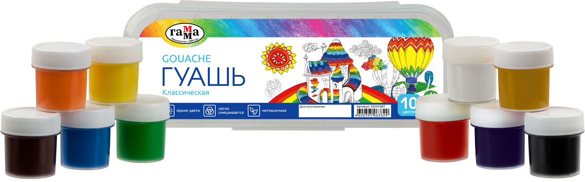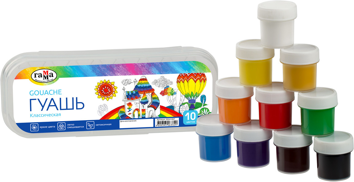💳 Оплатить за товар можно при получении 🇰🇿 Есть бесплатная доставка по Казахстану от 1 дня 🎁 Копите бонусы с каждой покупки Серия: Классическая Гуашь Гамма серии «Классическая» предназначена для творческих занятий в школе и дома. Краска производится на основе качественного прозрачного связующего вещества, обеспечивающего чистоту цвета, плотность покрытия, равномерно наносится практически на любую основу. При высыхании дает бархатистый матовый эффект. Цветовая палитра состоит из 10 классических оттенков краски, при смешивании которых легко получить новые цвета. Баночки упакованы в удобный пластиковый пенал, что гарантирует детям, школьникам и начинающим художникам порядок при работе с гуашью. Пенал имеет надежный и легкий в обращении замок, что исключит рассыпание и потерю баночек. Объём одной баночки — 17,5 мл. |