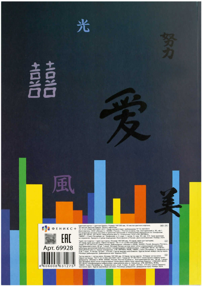 💳 Оплатить за товар можно при получении 🇰🇿 Есть бесплатная доставка по Казахстану от 1 дня 🎁 Копите бонусы с каждой покупки Серия: Кибер аниме Набор картона и бумаги Феникс+ предназначен для воплощения творческих идей детьми. В блоке использованы мелованный картон с серым оборотом 230 г/м² и газетная бумага с двусторонним прокрасом, плотностью 45г/м2. Блок имеет клеевое скрепление с обложкой. 10 цветов картона (1+0, 8 цветов+золото, серебро), 8 цветов бумаги, 16 листов (1+1). |