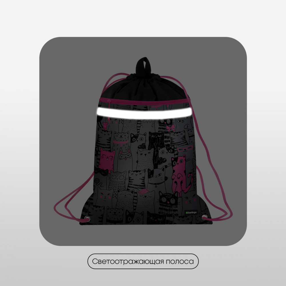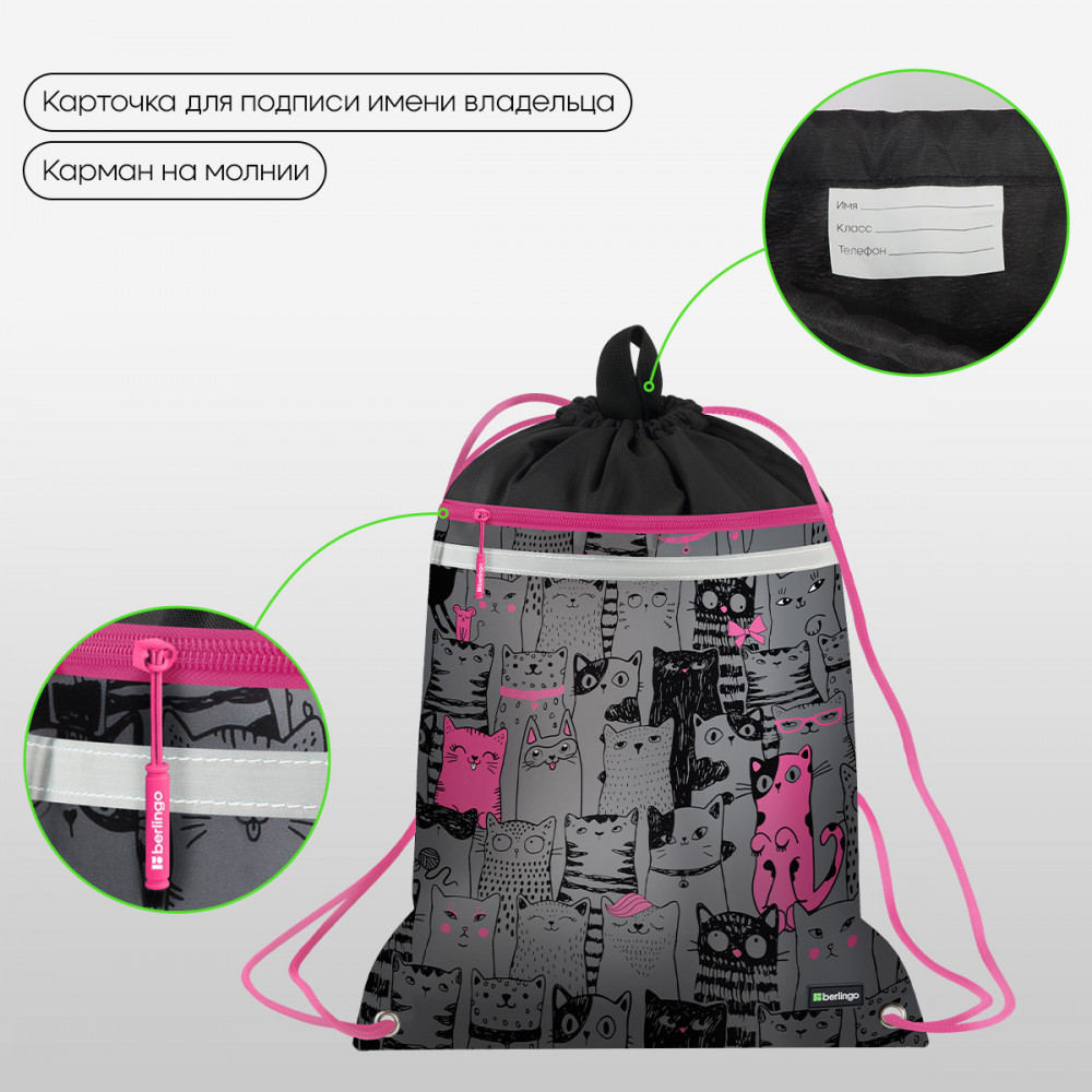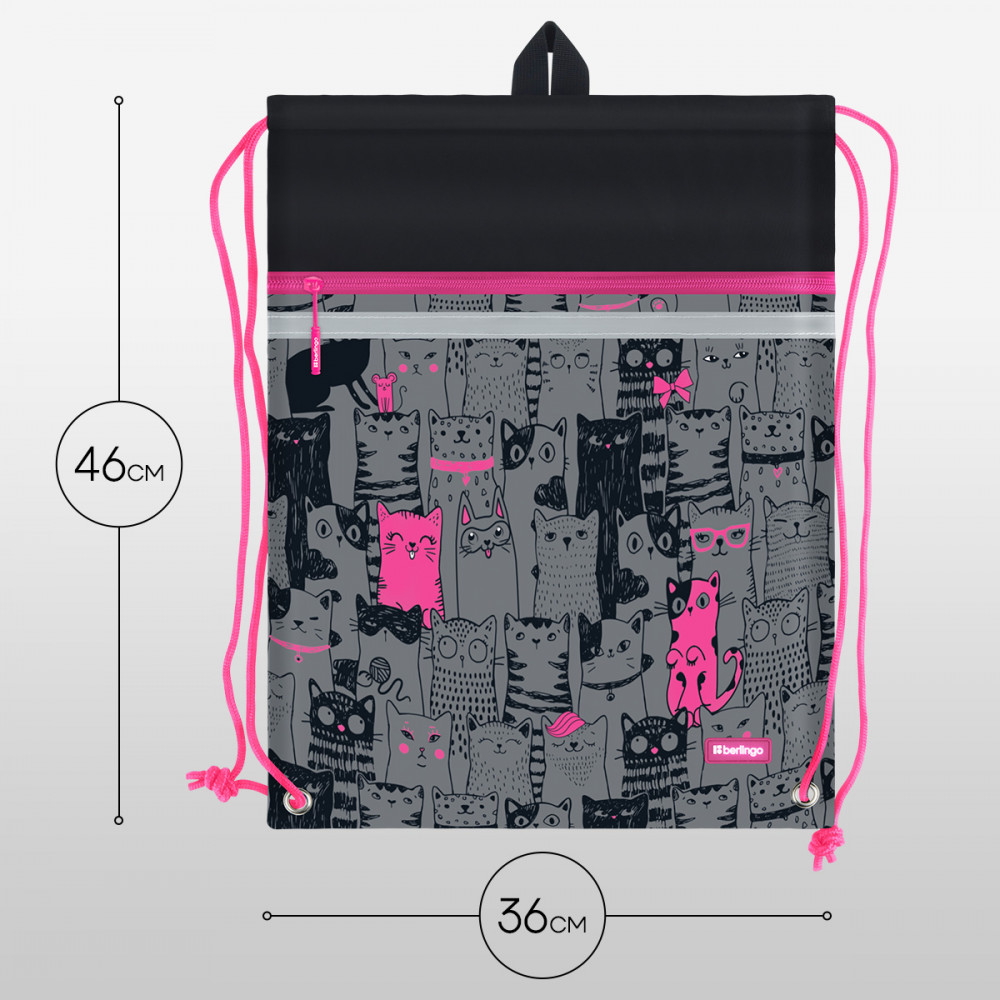 💳 Оплатить за товар можно при получении 🇰🇿 Есть бесплатная доставка по Казахстану от 1 дня 🎁 Копите бонусы с каждой покупки Серия: Happy Cats Вместительный мешок для обуви Berlingo оснащён прочными шнурками, светоотражающей полосой, вентиляционной сеточкой, передним карманом (34×34 см) на молнии и петлей для подвешивания, а также имеет бирку для подписи имени, класса и телефона. Размер изделия 36×46 см. Модель изготовлена из плотного полиэстера. Световозвращающие элементы обезопасят ребенка в тёмное время суток. Мешок идеален как для зимней обуви, так и для спортивной экипировки. |