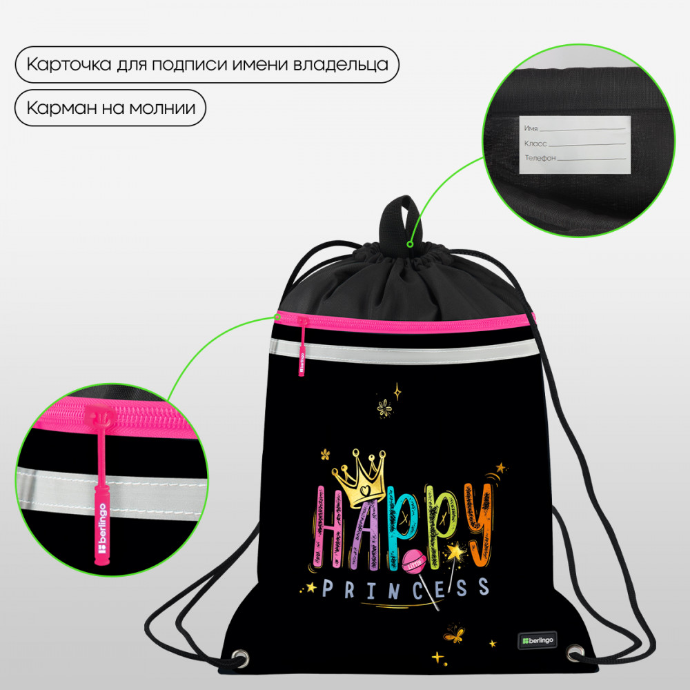 💳 Оплатить за товар можно при получении 🇰🇿 Есть бесплатная доставка по Казахстану от 1 дня 🎁 Копите бонусы с каждой покупки Серия: Candy Princess Вместительный мешок для обуви Berlingo оснащён прочными шнурками, светоотражающей полосой, вентиляционной сеточкой, передним карманом (34×34 см) на молнии и петлей для подвешивания, а также имеет бирку для подписи имени, класса и телефона. Размер изделия 36×46 см. Модель изготовлена из плотного полиэстера. Световозвращающие элементы обезопасят ребенка в тёмное время суток. Мешок идеален как для зимней обуви, так и для спортивной экипировки. |