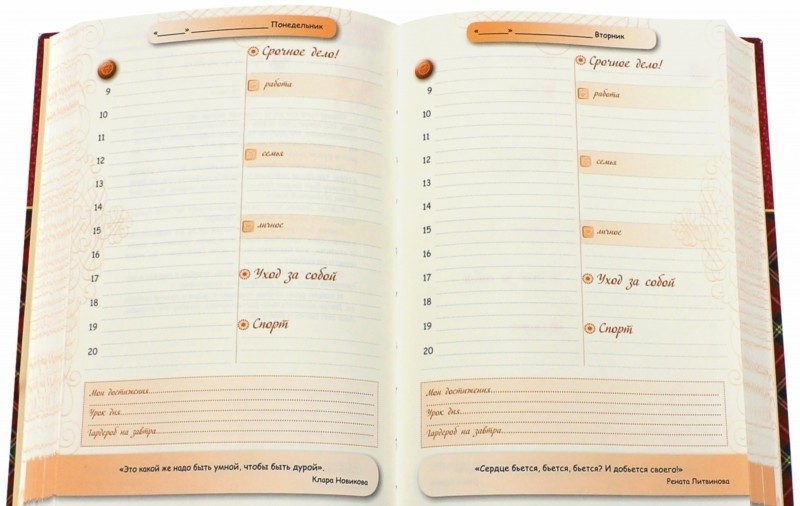 С этой вещью можно четко мечтать, ставить конкретные цели и планировать все это, делая шаг за шагом, добиваться этого!!! Это для тех женщин, которые верят в себя и не бояться стать по настоящему УСПЕШНЫМИ!!! Возьмите этот ежедневник, и он вам поможет в этом!!!