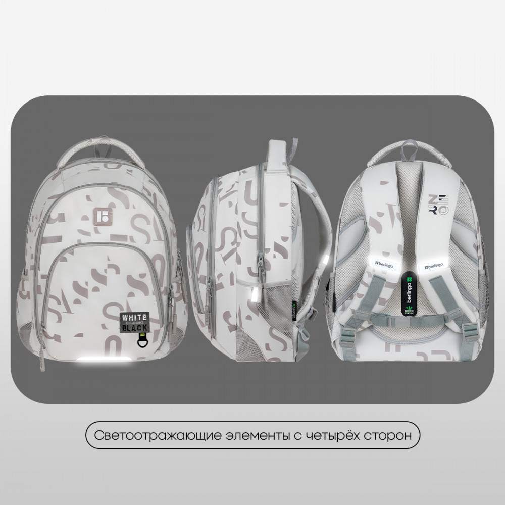 💳 Оплатить за товар можно при получении 🇰🇿 Есть бесплатная доставка по Казахстану от 1 дня 🎁 Копите бонусы с каждой покупки Серия: Trendy Beige Рюкзак Berlingo серии ErgoFit — отличный выбор для детей среднего и старшего школьного возраста. Имеет два отделения и три кармана. В него поместится всё необходимое. Размер — 30×17×42 см. Внутри — один карман на резинке и удобный органайзер. Рюкзак сделан из прочного полиэстера. Модель весит не более 650 гр. и вмещает до 21,4 литров. Эргономичная вентилируемая спинка с мягкими спонжевыми подушечками, широкие регулируемые лямки и съемное нагрудное крепление обеспечивают равномерное распределение нагрузки на позвоночник. Уплотненное дно, плотная ручка для переноски и ручка-петля делают рюкзак максимально удобным. Светоотражающие элементы с 4 сторон помогают обеспечить безопасность ребенка в темное время суток. Рюкзак закрывается на пластиковую молнию с удобными бегунками. Изделие упаковано в пакет. |