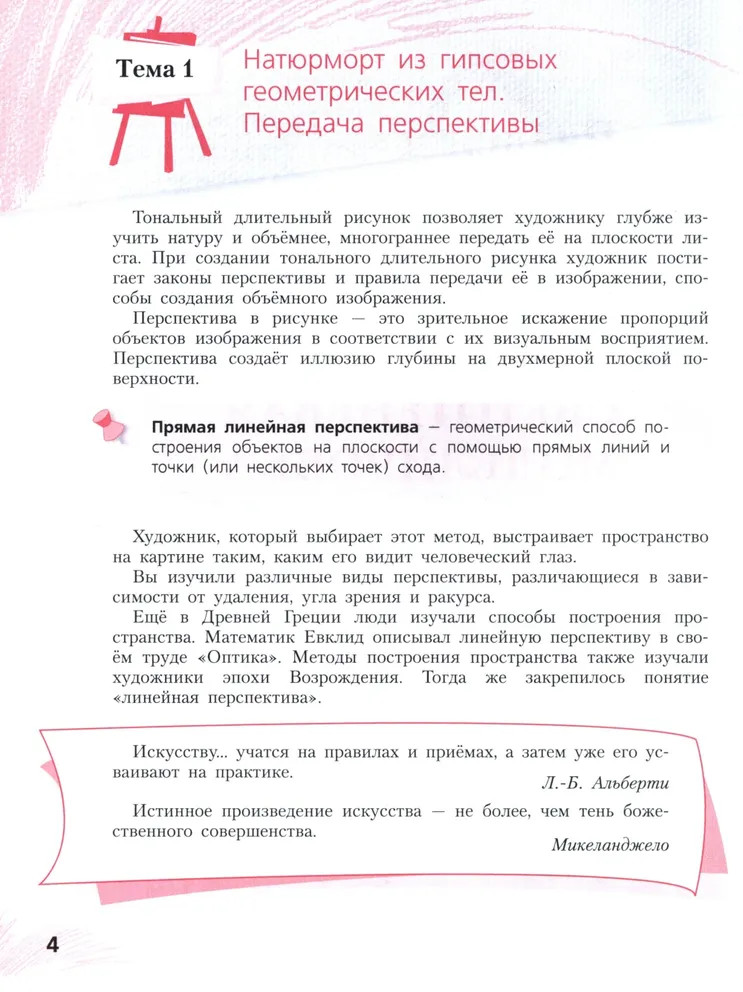 Учебное пособие предназначено для учащихся детских художественных школ и школ искусств. Подготовлено в соответствии с Федеральными государственными требованиями к дополнительным предпрофессиональным программам. Пособие может быть также полезным для учащихся всех организаций дополнительного образования и общеобразовательных организаций с углублённым изучением предметов образовательной области «Искусство». Пособие для четвёртого года обучения знакомит с художественными материалами и приёмами работы ими, раскрывает особенности тонального длительного, живописного и линейного рисунков, рассказывает о последовательности изображения драпировок разной сложности, натюрморта с металлической и стеклянной посудой, а также создания зарисовок фигуры человека в движении, набросков по памяти отдельных предметов и т. д.