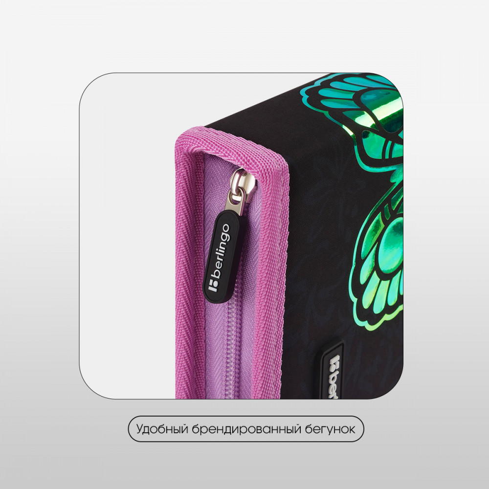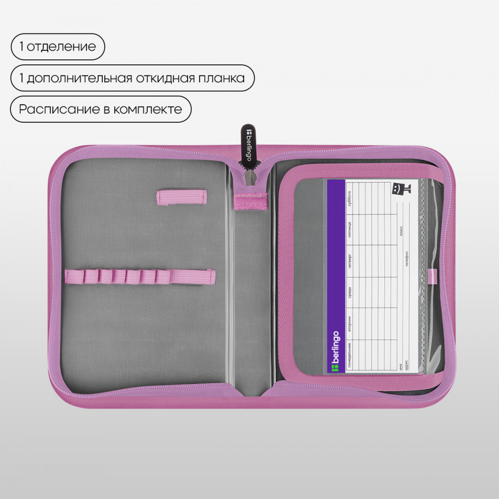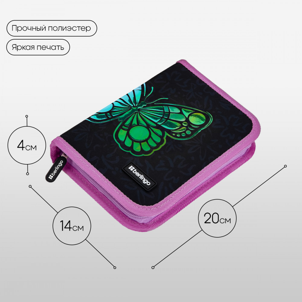 💳 Оплатить за товар можно при получении 🇰🇿 Есть бесплатная доставка по Казахстану от 1 дня 🎁 Копите бонусы с каждой покупки Серия: Butterfly Effect Каркасный пенал Berlingo помогает школьнику хранить канцелярские принадлежности в одном месте. Изделие размером 200×140×40 мм не занимает много места в рюкзаке. В одно отделение помещается 25 предметов. За счёт креплений-резиночек для канцтоваров внутри пенала легко поддерживать порядок. Одна откидная планка увеличивает вместимость изделия и позволяет всегда держать расписание уроков перед глазами. Благодаря крупному бегунку ребёнку удобно открывать пенал на молнии. Лицевая поверхность сделана из износостойкого полиэстера, а внутренняя — из текстурного ПВХ. |