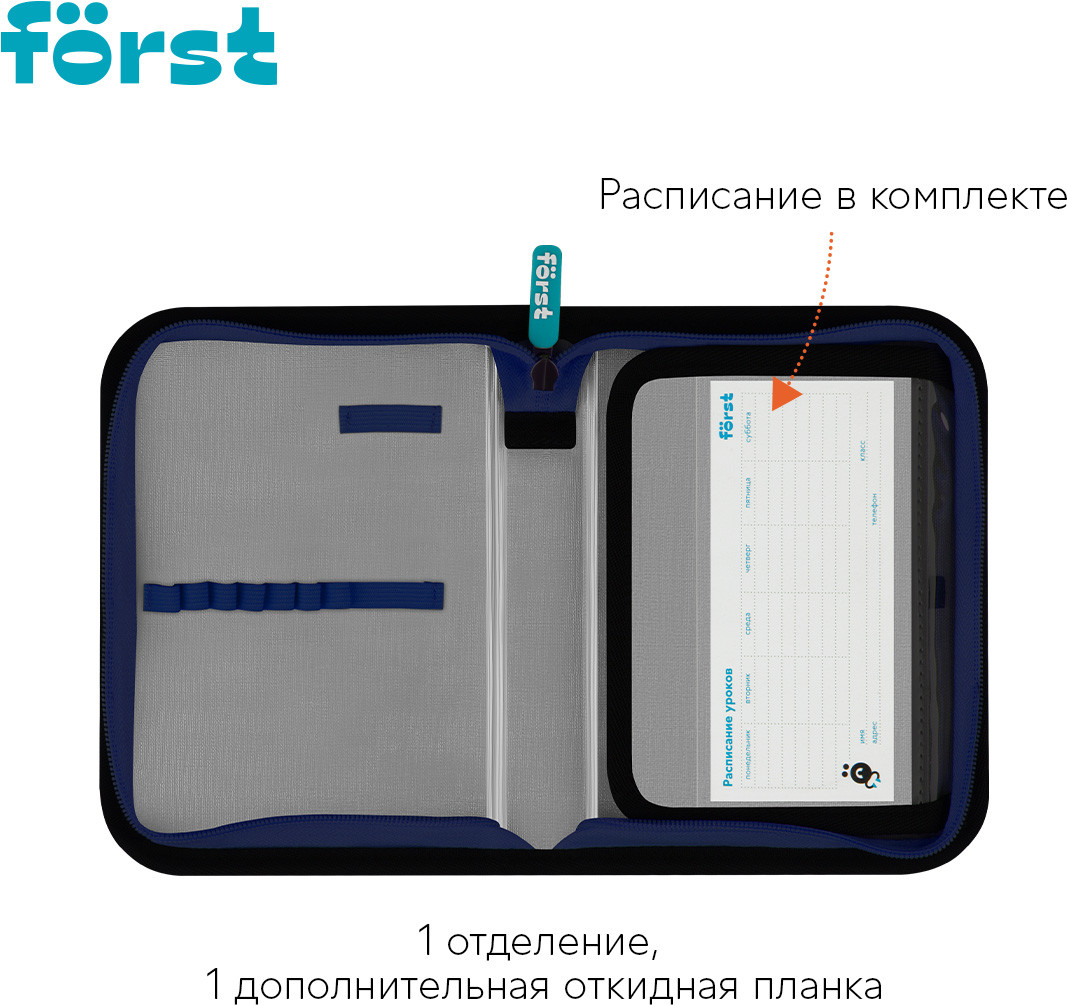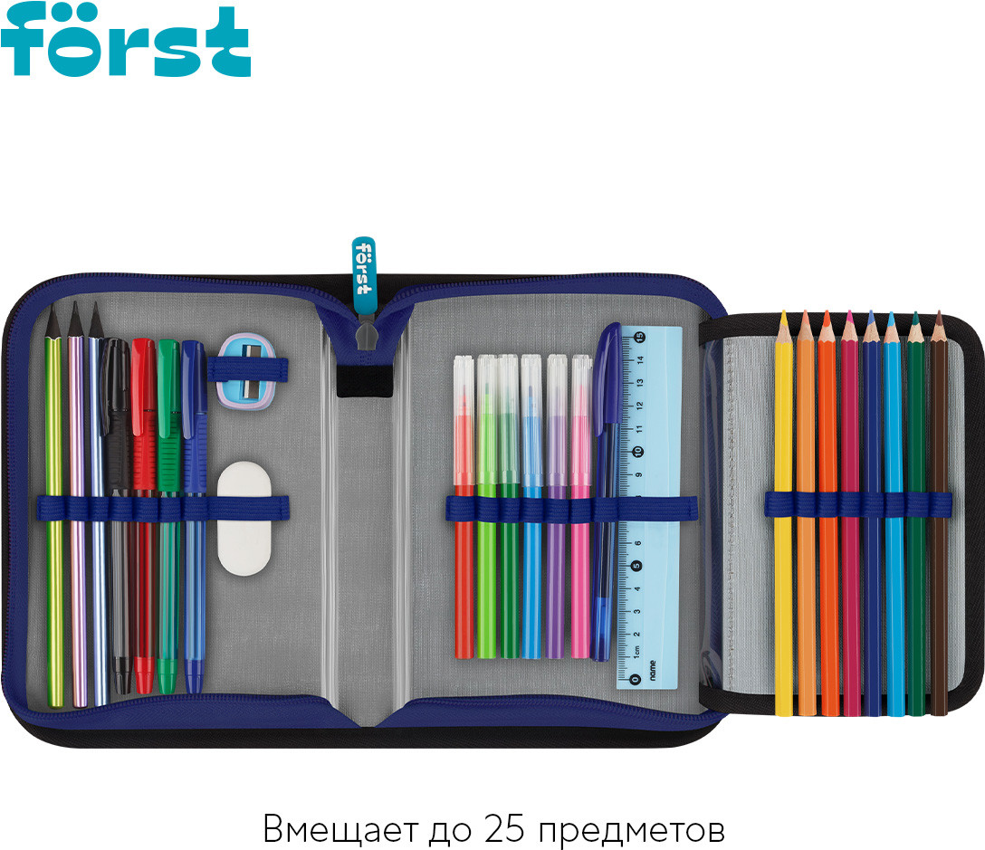 Forst Пенал школьныйВ данный момент этот товар отсутствует в продаже. Возможно, у нас найдется аналогичный или похожий товар здесь. Серия: Extra Power Каркасный пенал Först помогает школьнику хранить канцелярские принадлежности в одном месте. Изделие размером 200×140×40 мм не занимает много места в рюкзаке. В одно отделение помещается 25 предметов. За счёт креплений-резиночек для канцтоваров внутри пенала легко поддерживать порядок. Одна откидная планка увеличивает вместимость изделия и позволяет всегда держать расписание уроков перед глазами. Благодаря крупному резиновому бегунку ребёнку удобно открывать пенал на молнии. Лицевая поверхность сделана из износостойкого полиэстера с принтом, а внутренняя — из текстурного ПВХ. |