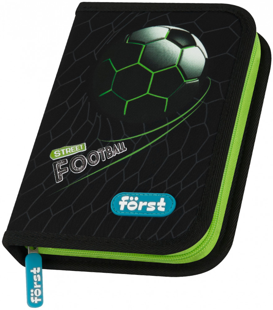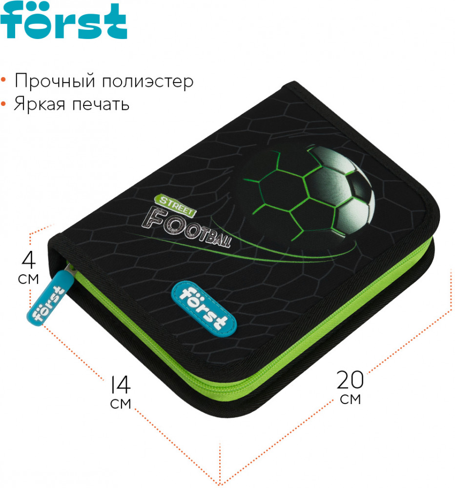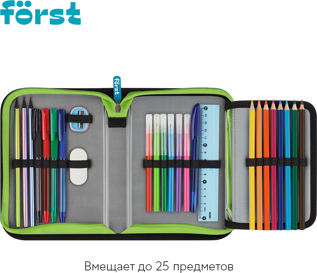 Каркасный пенал Först помогает школьнику хранить канцелярские принадлежности в одном месте. Изделие размером 200×140×40 мм не занимает много места в рюкзаке. В одно отделение помещается 25 предметов. За счёт креплений-резиночек для канцтоваров внутри пенала легко поддерживать порядок. Одна откидная планка увеличивает вместимость изделия и позволяет всегда держать расписание уроков перед глазами. Благодаря крупному резиновому бегунку ребёнку удобно открывать пенал на молнии. Лицевая поверхность сделана из износостойкого полиэстера с принтом, а внутренняя — из текстурного ПВХ.