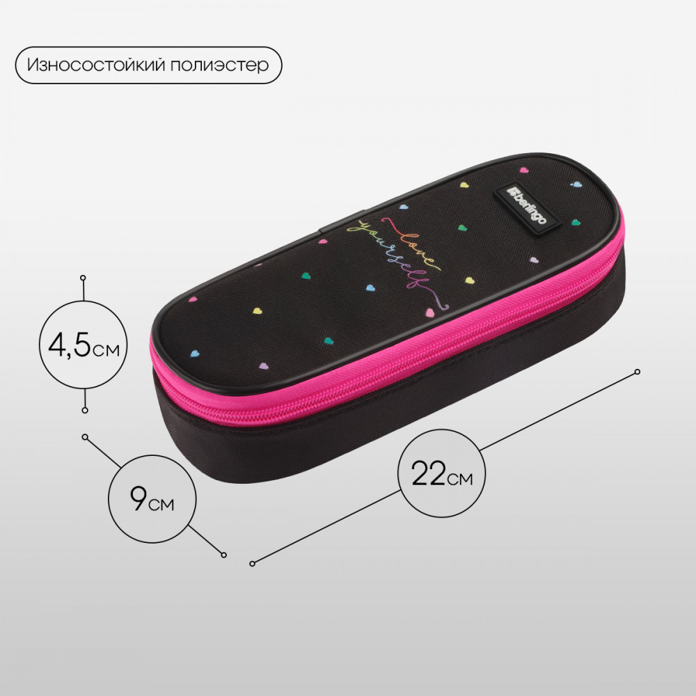 💳 Оплатить за товар можно при получении 🇰🇿 Есть бесплатная доставка по Казахстану от 1 дня 🎁 Копите бонусы с каждой покупки Серия: Love Yourself Пенал-футляр школьный корпусный Berlingo поможет аккуратно хранить канцелярские принадлежности. Изделие овальной формы размером 220×90×45 мм имеет одно вместительное отделение на молнии. Материал лицевой поверхности и подкладки — полиэстер. На верхней откидной крышке расположены крепления-резиночки для канцелярских принадлежностей. |