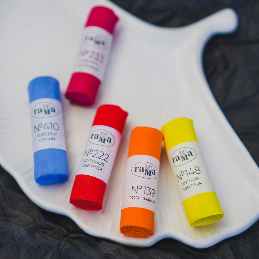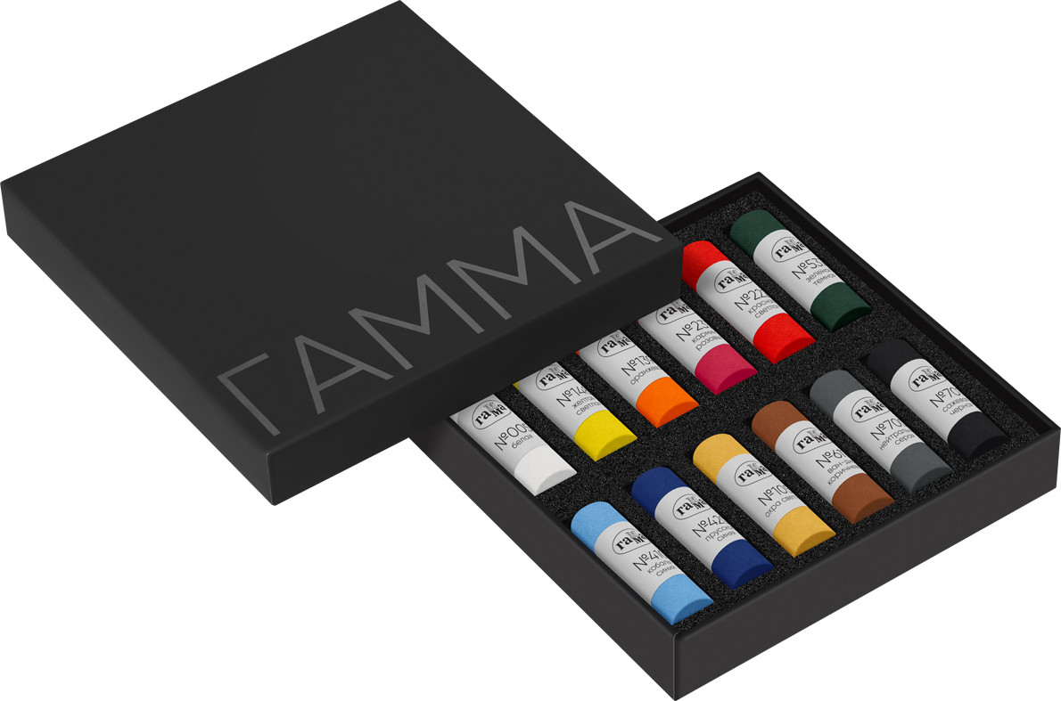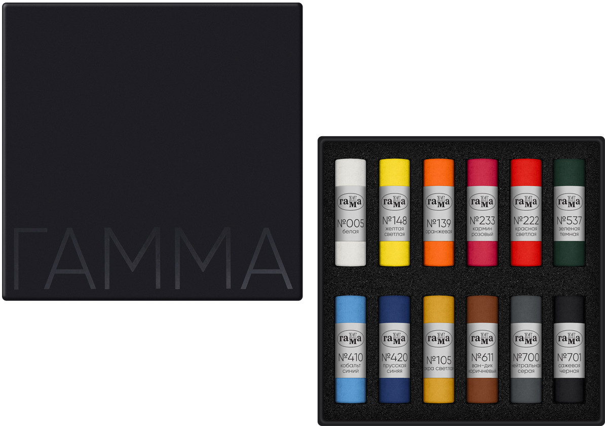 Набор сухой художественной пастели Гамма состоит 12 базовых цветов, подходит для профессионалов и начинающих художников. Для производства пастели используются тонкотертые пигменты и каолиновая глина высочайшего качества. Каждый мелок круглой формы оптимально мягкий и в меру хрупкий. Диаметр мелка составляет 1.5 см, а длина — 4.8 см. Художественная пастель Гамма обладает глубиной и интенсивностью цвета. Цвета в палитре легко смешиваются между собой и создают мягкие переходы одного оттенка к другому. Цвета ровно ложатся на бумагу разных фактур. Набор упакован в картонную коробку.