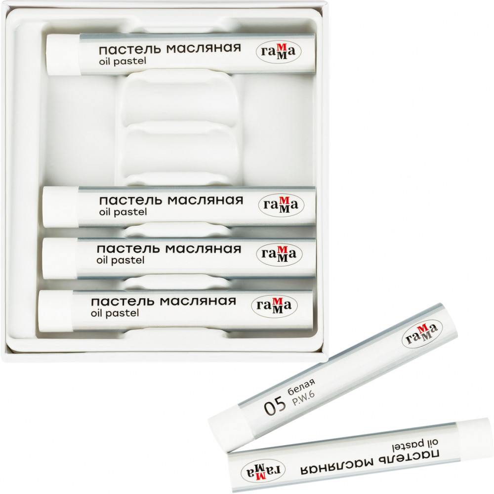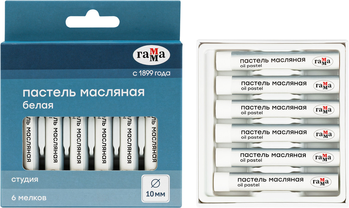Масляная пастель Гамма серии «Студия» изготовлена на основе тонкотертых пигментов и минерального масла. В наборе 6 мелков белого цвета. Мелки имеют увеличенный диаметр 10 мм, длина составляет 70 мм. Белый – самый используемый цвет, с помощью которого можно получать новые оттенки, прорисовывать блики, работать со светом и тенью.