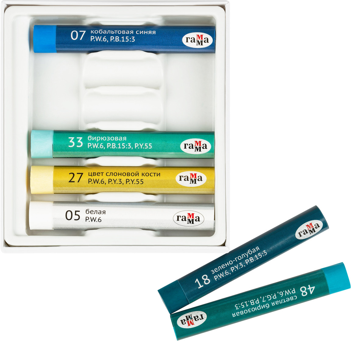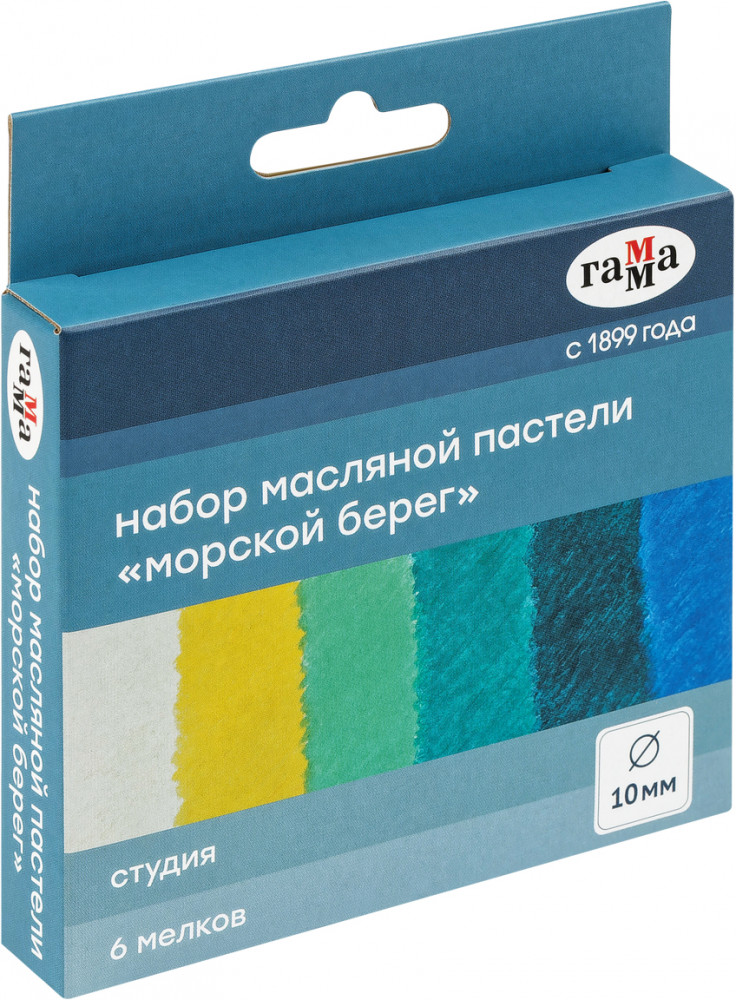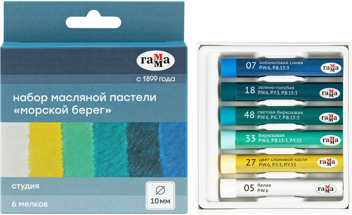 Масляная пастель Гамма серии «Студия» изготовлена на основе тонкотертых пигментов и минерального масла. В наборе «Морской берег» тематическая палитра из 6 цветов пастели: кобальтовая синяя, зелёно-голубая, светлая бирюзовая, бирюзовая, цвет слоновой кости, белая. Мелки имеют увеличенный диаметр 10 мм, длина составляет 70 мм.