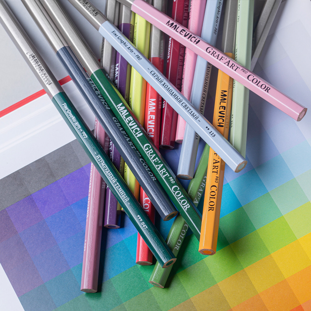 Серия из художественных цветных шестигранных карандашей средней мягкости «Малевичъ» Graf’Art Pro для графики и смешанных техник. Палитра оттенков протестирована и собрана совместно с художницей Евгенией Лавровой и подходит для многослойных иллюстраций в разных стилях и тематиках, — как для реализма, так и для скетчинга. Создавайте рисунки с помощью контуров и плотной штриховки до 5-7 слоев и до 10-12 слоев при легкой штриховке.