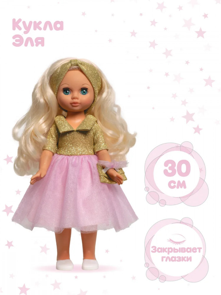 Рост куклы 30 см. Кукла Эля не озвучена. Глаза вставные закрывающиеся. Цвет глаз может варьироваться. Ручки и голова выполнены из эластичного, приятного на ощупь винила, а туловище и ноги из пластмассы.