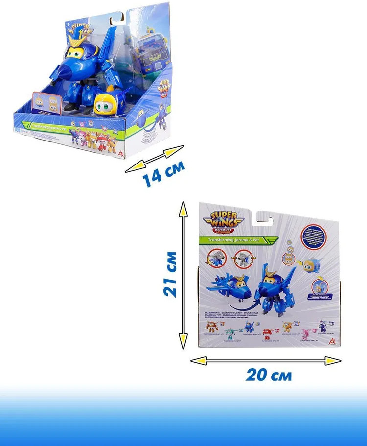 💳 Оплатить за товар можно при получении 🇰🇿 Есть бесплатная доставка по Казахстану от 1 дня 🎁 Копите бонусы с каждой покупки Джером — трансформер и новый главный герой из мультфильма «Супер Крылья». В 7 сезоне у Джерома появляется новый маленький друг Супер питомец Джером. В набор входят фигурка Джерома и фигурка ее питомца. Игрушка-трансформер Джером может трансформироваться из самолёта в робота всего за 10 шагов. У питомца вручную меняется выражение лица, а при нажатии на кнопку загорается световой сигнал на крыльях игрушки. Фигурка оснащена подвижными колёсиками, так, что ребенок может катать ее как самолетик. Полностью повторяет облик героя из одноименного мультфильма. Игрушка подходит для индивидуальных и коллективных сюжетных игр. Сертифицировано для детей. |