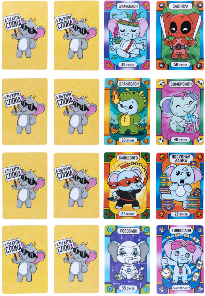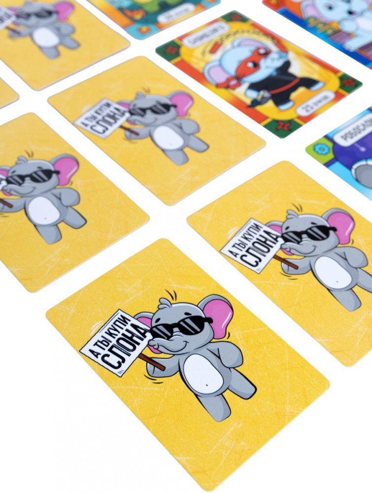 В каждом раунде вас ждет захватывающий аукцион, где в роли товара выступают уникальные слоны: слондзяго, шамаслон, робослон, слонпул, дракослон и зомбислон. Поднимите свои карты, объявите количество и начните торги! Обменивайтесь с другими игроками, ищите самые выгодные сделки, чтобы собрать полный комплект из восьми одинаковых слонов.