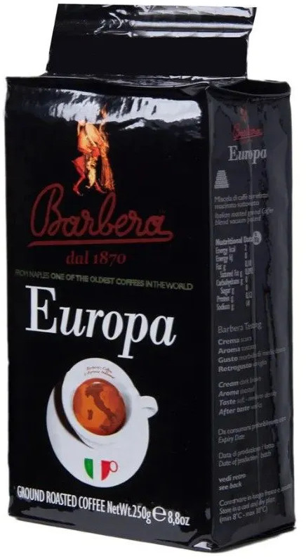 Молотый кофе Barbera Europa состоит из смеси размолотых высококачественных кофейных зерен, тщательно отобранных в Бразилии и Индонезии. Классический итальянский кофе из Неаполя с бодрящим ароматом, сильным, насыщенным, цельным, полным тела вкусом, оставляющий за собой длительное и приятное послевкусие горького шоколада. Подходит для любого типа приготовления ароматного напитка: в кофейнике, во френч-прессе и гейзерных кофеварках. Мягкий и легкий, но с богатым и поджаренным ароматом. Состав — арабика (50%) и робуста (50%).