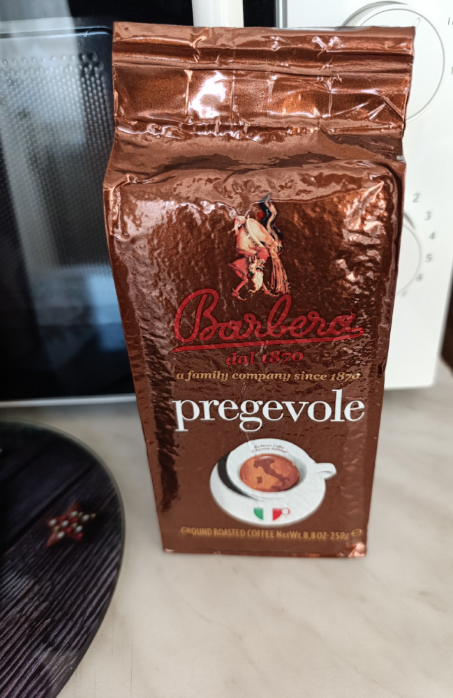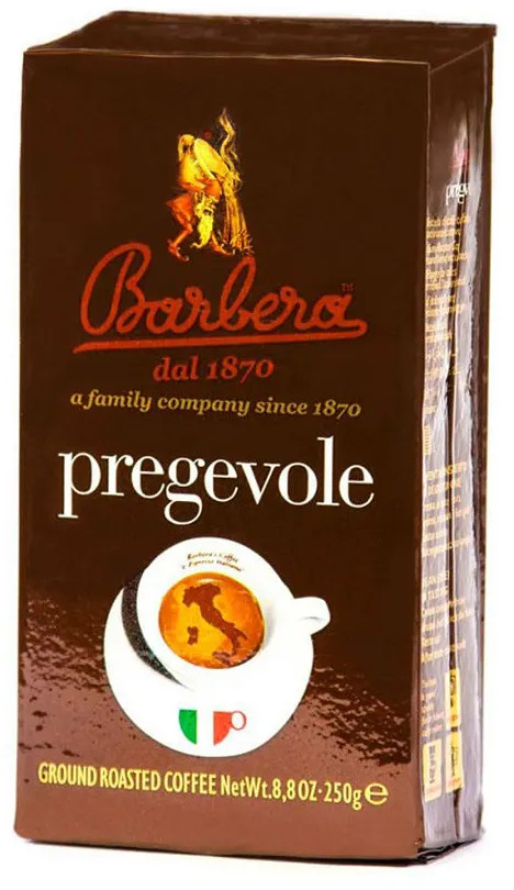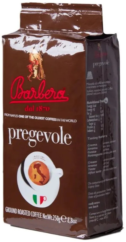Молотый кофе Barbera Pregevole состоит из смеси высококачественных размолотых кофейных зерен, бережно собранных и тщательно отобранных под чутким контролем представителей компании в местах произрастания — плантациях кофе в Бразилии, стран Центральной Америки и Индонезии. Кофе с характерным ароматом, сильным, насыщенным, цельным вкусом, оставляющий за собой длительное и приятное послевкусие горького шоколада и ноток южных фруктов. При приготовлении в Espresso аппаратах даёт густую кремообразную пенку. Подходит для любого типа приготовления ароматного напитка в кофейнике, турке, во френч-прессе и гейзерных кофеварках. Состав — арабика (60%) и робуста (40%).