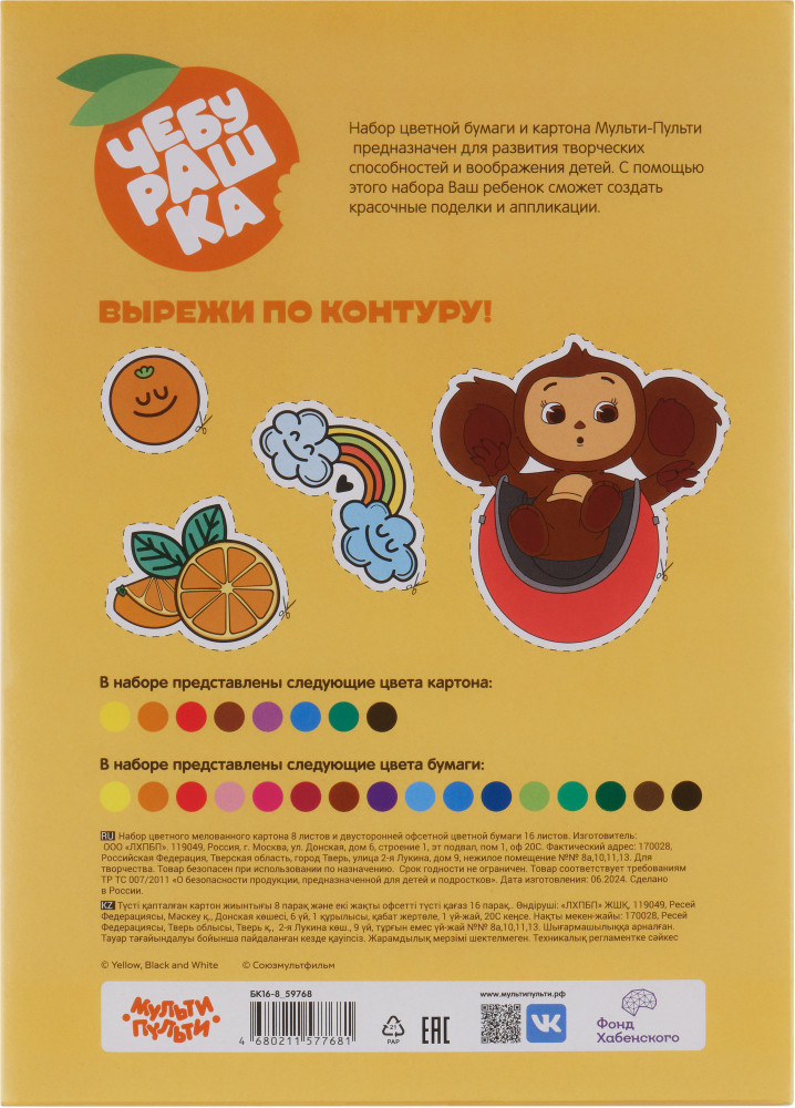 💳 Оплатить за товар можно при получении 🇰🇿 Есть бесплатная доставка по Казахстану от 1 дня 🎁 Копите бонусы с каждой покупки Серия: Чебурашка Набор из цветной бумаги и цветного картона «Мульти-Пульти» в папке с 2 клапанами и яркой обложкой − это замечательный материал для воплощения творческих идей детьми. В набор входят 40 листа формата А4: 8 цветов ассорти мелованного картона плотностью 200 г/м2 и 32 листов ассорти цветной бумаги. Творчество с «Мульти-Пульти» − это всегда интересно! |