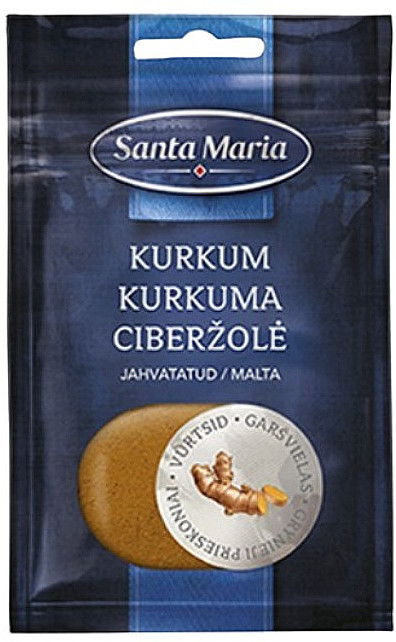Куркума стала популярной только в 21 веке, когда знания о ее целебных свойствах дошло до более широкой публики (на протяжении веков куркуму использовали в аюрведической медицине). Куркуму Santa Maria получают в Индии, в штатах Тамилнад и Махараштра. Это пряность со средним (3%) содержанием куркумина (сильный антиоксидант, желтый краситель).