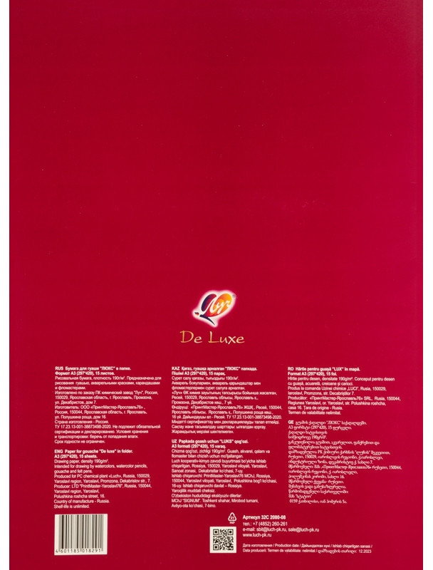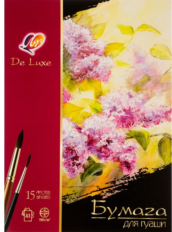 Бумага для гуаши «Люкс» — высококачественная рисовальная бумага. Предназначена для рисования гуашью, акрилом, подойдёт также для чернографитных, цветных и акварельных карандашей, восковых мелков, фломастеров и других мягких художественных материалов. Папка с бумагой для гуаши идеально подходит для детей, учащихся и студентов. Состоит из 15 листов плотной бумаги без тиснения. Данная бумага позволяет работать на ней различными материалами, что делает привлекательным данное изделие для художественных школ и кружков, ведь уроки начинаются с техники рисования именно гуашевыми красками.