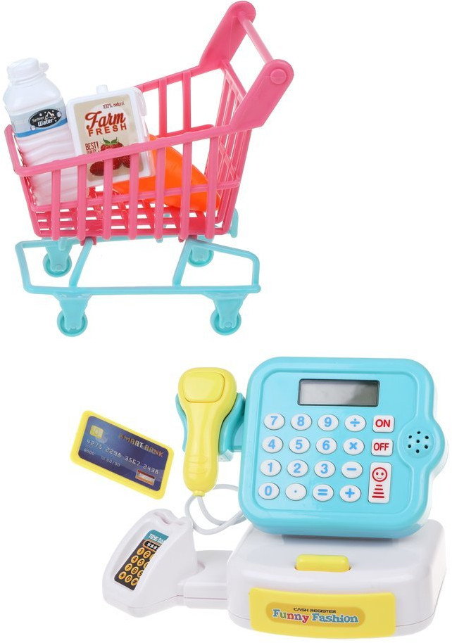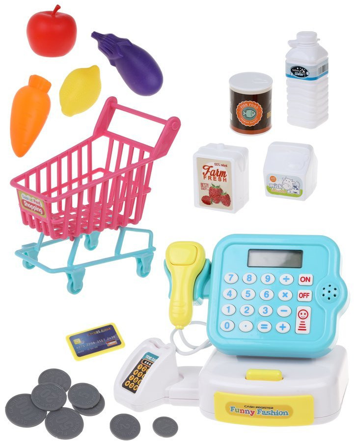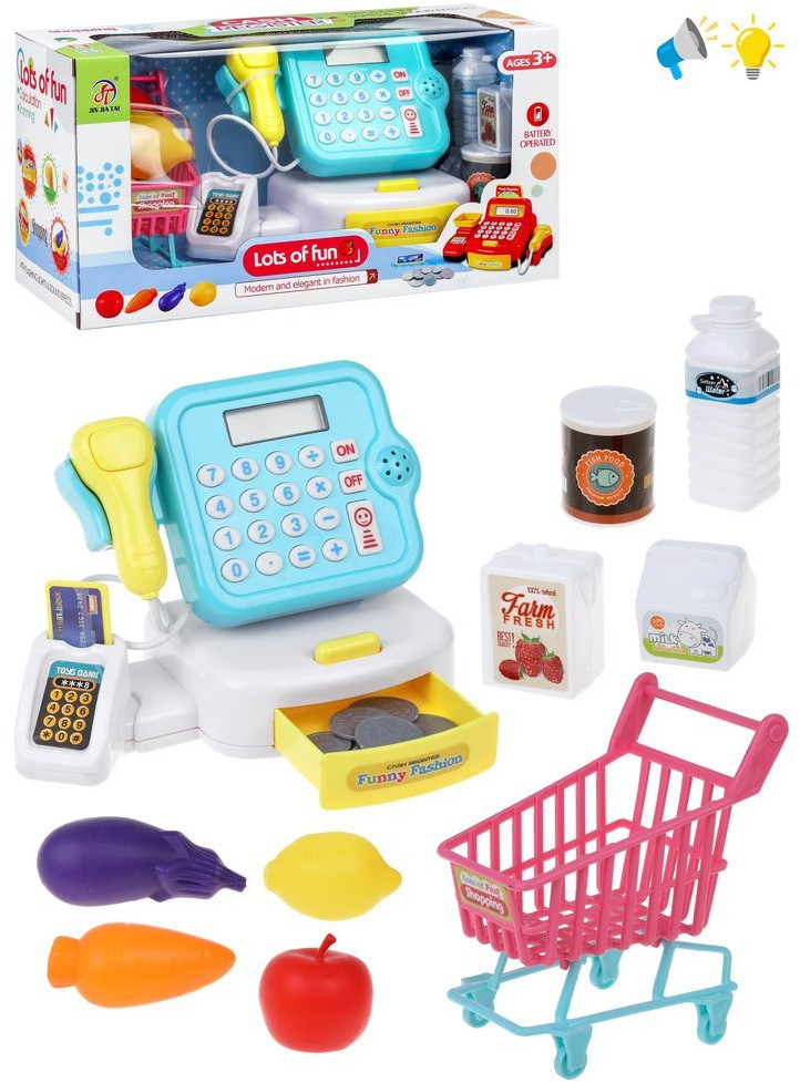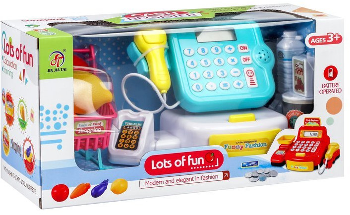 Ящик кассы открывается при нажатии кнопку. Светозвуковые эффекты работают от 2-х батареек типа АА на 1.5 V (не входят в комплект). Размер кассы вместе со сканером: 19×9×x13 см. Размер тележки: 10×8×10 см.