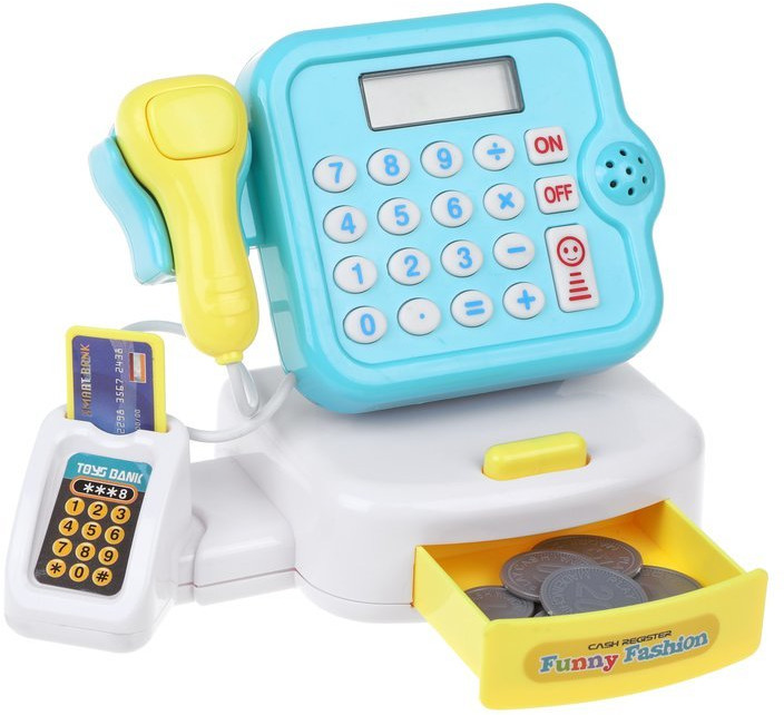 • касса с настоящим калькулятором, функциональным сканером (пикает, светится при нажатии на кнопку);